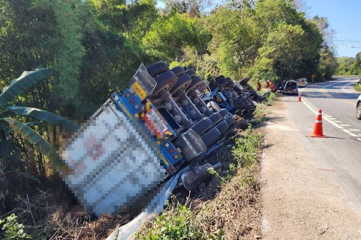 รถเทรลเลอร์พลิกตะแคงลงข้างทาง ริมถนนสายลี้ - เถิน มีผู้เสียชีวิตติดค้างในซากรถ จ.ลำพูน