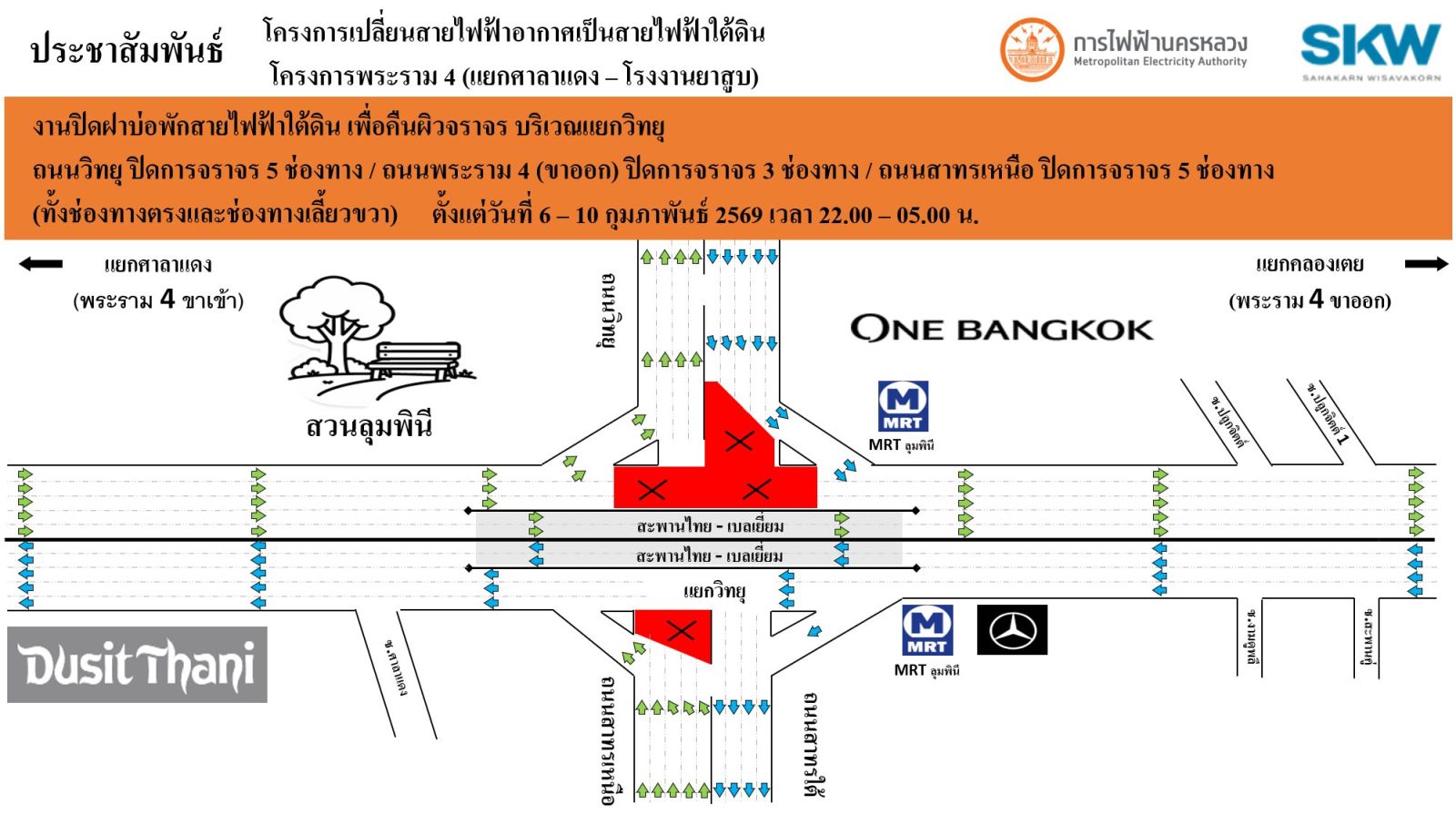 MEA แจ้งปิดเบี่ยงจราจรแยกวิทยุ-พระราม 4 โครงการสายไฟฟ้าใต้ดิน 6-10 ก.พ. 69