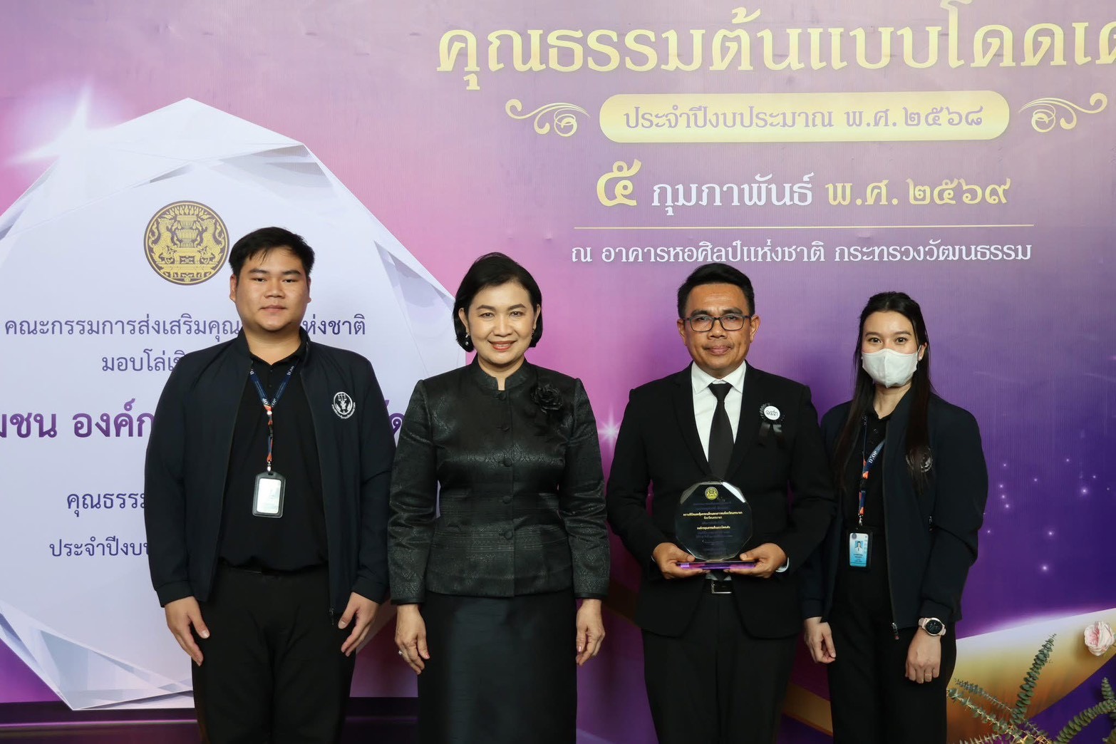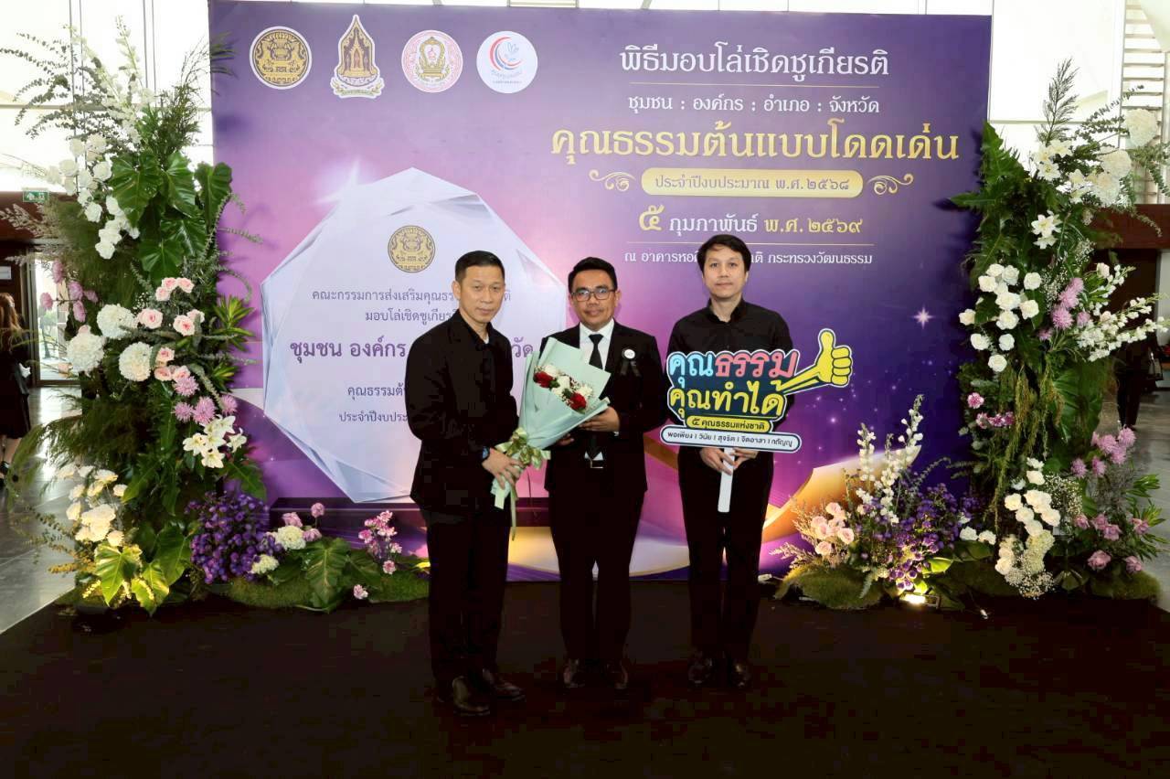 นายราเมศ ลิ่มสกุล วัฒนธรรมจังหวัดนครนายก พร้อมด้วยบุคลากรสำนักงานวัฒนธรรมจังหวัดนครนายก ชุมชน องค์กร และอำเภอคุณธรรมต้นแบบโดดเด่นของจังหวัดนครนายก เข้ารับมอบโล่เชิดชูเกียรติชุมชน องค์กร อำเภอ และจังหวัดคุณธรรมต้นแบบโดดเด่น ประจำปีงบประมาณ 2568 จากนายบวรศักดิ์ อุวรรณโณ รองนายกรัฐมนตรี ประธานพิธี ซึ่งในโอกาสนี้ ได้นำเครือข่ายชุมชนวัดเลขธรรมกิตติ์ เข้าร่วมจัดแสดงนิทรรศการ และสาธิตผลิตภัณฑ์ชุมชนอีกด้วย ณ อาคารหอศิลป์แห่งชาติ กระทรวงวัฒนธรรม เมื่อวันที่ 5 กุมภาพันธ์ 2569
