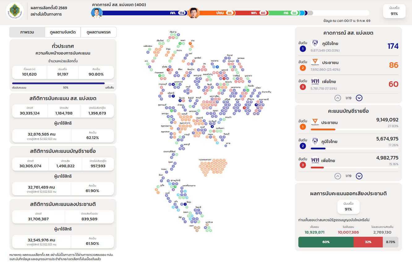 ทั้งนี้ ความล่าช้าในบางพื้นที่เกิดจากสภาพอากาศที่มีฝนตกหนักและลมกรรโชกแรง โดยเฉพาะพื้นที่กรุงเทพฯ ฝั่งตะวันออก ส่งผลต่อการใช้งานระบบรายงานผล ซึ่งขณะนี้ได้เร่งแก้ไขและระบบเริ่มกลับมาใช้งานได้ตามปกติ ทำให้การนับคะแนนดำเนินต่อไปอย่างต่อเนื่อง
