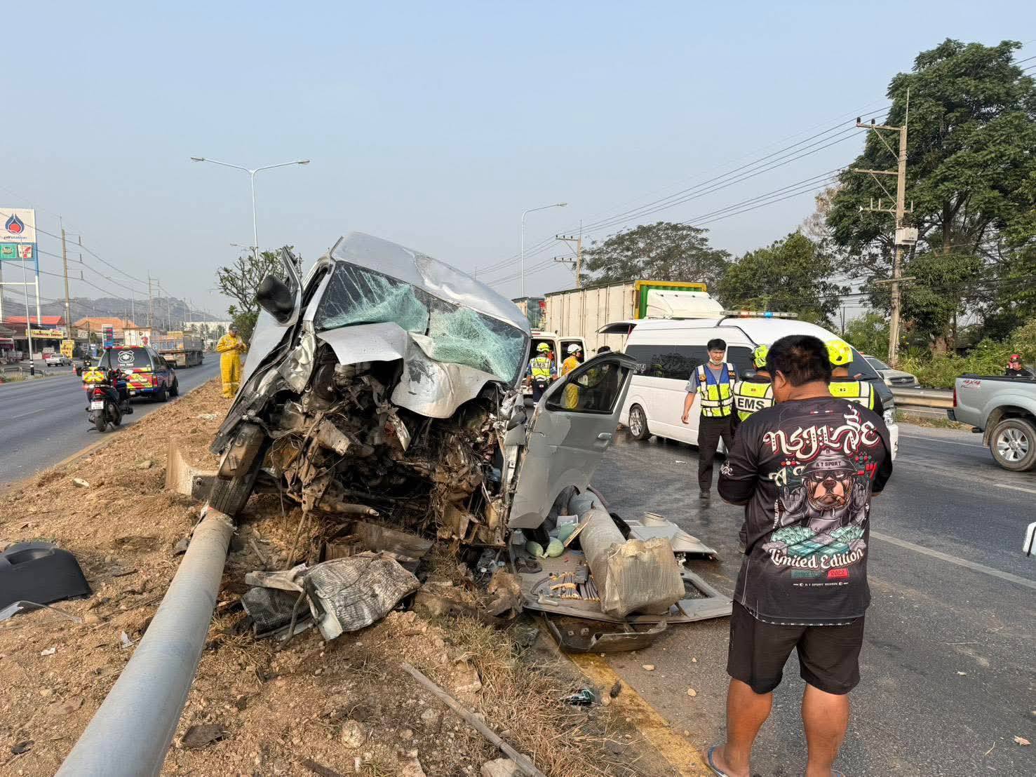 วันที่ 8 กุมภาพันธ์ 2569 พ.ต.ท. สายชล ดงเรืองศรี สว.(สอบสวน) สภ. กลางดง อ.ปากช่อง จ.นครราชสีมา รับแจ้งอุบัติเหตุรถตู้หลับในขึ้นเกาะกลางถนนชนเสาไฟฟ้าและป้ายของกรมทางหลวง และมีผู้ได้รับบาดเจ็บหลายราย บนถนนมิตรภาพ กม.39-40 ขาเข้านครราชสีมา ต.พยาเย็น อ.ปากช่อง จ.นครราสีมา