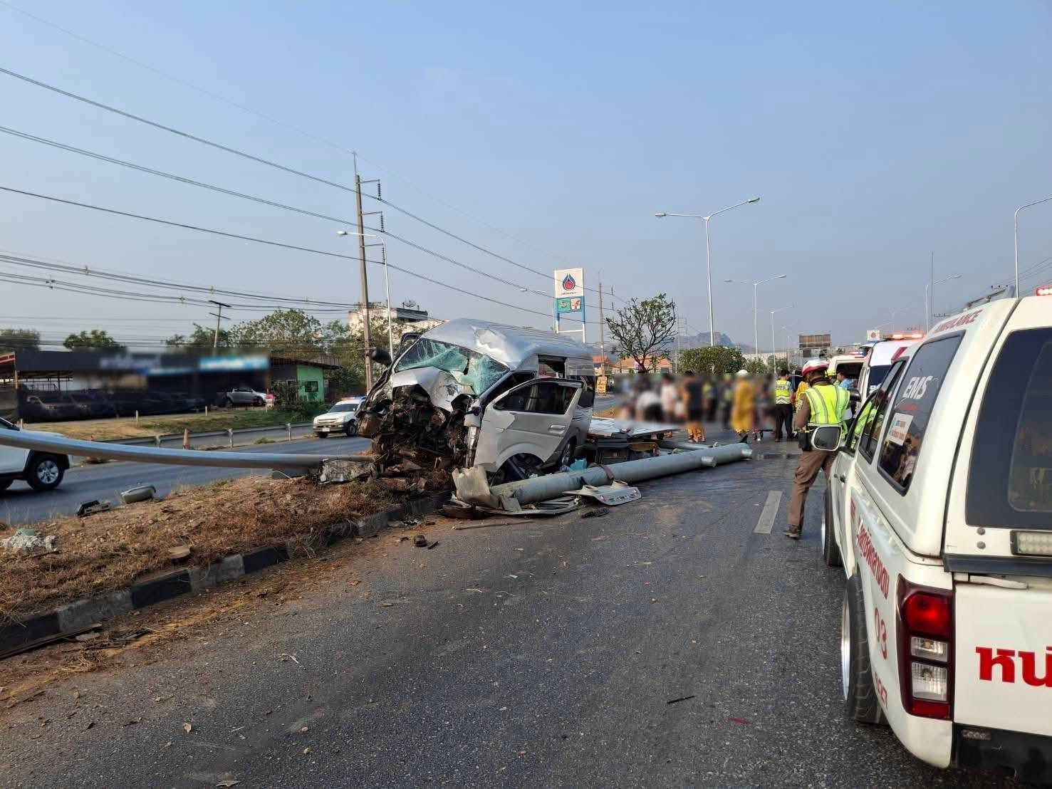 รถตู้พาคนจากสมุยจะไปเลือกตั้งที่ชัยภูมิ คนขับหลับใน เสียหลักชนเสาไฟบาดเจ็บยกคัน กลางถนนสายมิตรภาพ จ.นครราชสีมา