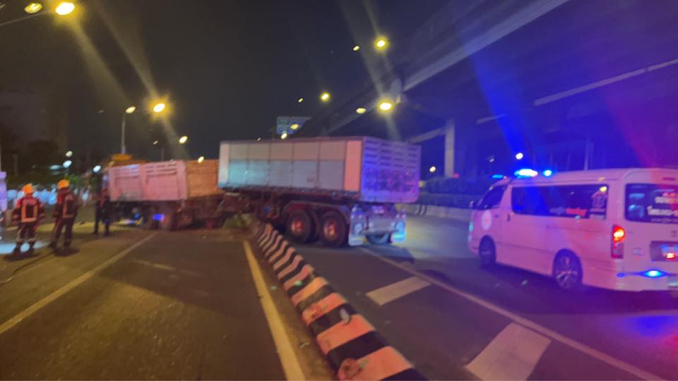 สน.วิภาวดี แจ้งว่า กรณีรถบรรทุกพ่วง เสียหลักชนขอบทาง ถนนวิภาวดีรังสิต ขาเข้า ช่วงหน้าทางเข้าศูนย์ฝึก รด. ในช่องทางหลักแล้วพุ่งข้ามไปกีดขวางในช่องคู่ขนาน