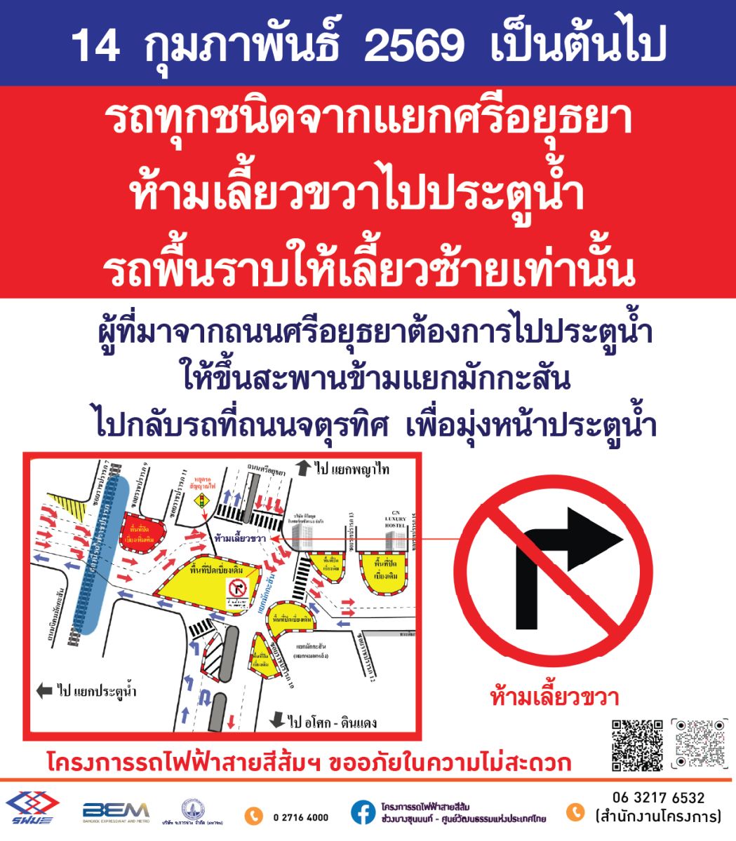 รถทุกชนิดจากแยกศรีอยุธยา ห้ามเลี้ยวขวาไปประตูน้ำ
