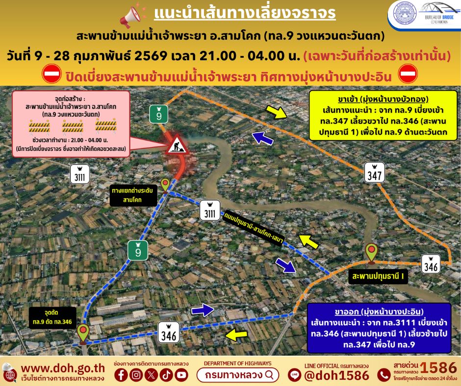 กรมทางหลวง โดยสำนักก่อสร้างสะพาน แนะนำเส้นทางเลี่ยง บนทางหลวงหมายเลข 9 (วงแหวนตะวันตก) กม.73+900 ถึง กม.75+900 ช่วงสะพานข้ามแม่น้ำเจ้าพระยา อ.สามโคก จ.ปทุมธานี เพื่อดำเนินการยกติดตั้ง Form Traveller (โครงสร้างชั่วคราว) สำหรับงานก่อสร้างสะพานข้ามแม่น้ำเจ้าพระยา ระหว่างวันที่ 9 - 28 กุมภาพันธ์ 2569 ตั้งแต่เวลา 21:00 - 04:00 น. (ปิดเฉพาะวันที่มีการก่อสร้างเท่านั้น)