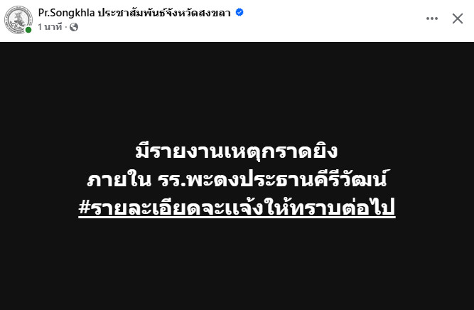 ทางด้าน เพจสถานีโทรทัศน์แห่งประเทศไทย จ.ยะลา รายงานด้วยเช่นกันว่า มีรายงานเหตุพยายามก่อเหตุกราดยิงภายในโรงเรียนพะตงประธานคีรีวัฒน์ อำเภอหาดใหญ่ จังหวัดสงขลา โดยเมื่อช่วงเวลาประมาณ 16.45 น. วันที่ 11 กุมภาพันธ์ 2569 เบื้องต้นพบว่ายังมีนักเรียนจำนวนหนึ่งติดค้างอยู่ภายในพื้นที่ และมีรายงานการจับครูและนักเรียนเป็นตัวประกัน ขณะนี้เจ้าหน้าที่ตำรวจและหน่วยงานที่เกี่ยวข้องได้เข้าควบคุมสถานการณ์อย่างเร่งด่วน