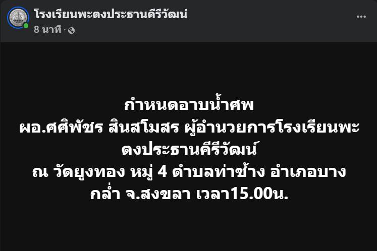 จากกรณีคนร้ายเป็นเยาวชน อายุ 17 ปี คลุ้มคลั่ง ถืออาวุธปืนบุกเข้าไปในโรงเรียนพะตงประธานคีรีวัฒน์ ต.พะตง อ.หาดใหญ่ จ.สงขลา และได้ก่อเหตุยิงครูและนักเรียนได้รับบาดเจ็บ วานนี้ (11 กุมภาพันธ์ 2569) เหตุการณ์ดังกล่าวส่งผลให้ นางศศิพัชร สินสโมสร ผู้อำนวยการโรงเรียนพะตงประธานคีรีวัฒน์ จังหวัดสงขลา ถูกยิงเข้าบริเวณอกด้านซ้าย เจ้าหน้าที่รีบนำตัวส่ง รพ.หาดใหญ่ แพทย์เวรได้ทำการผ่าตัดและเฝ้าติดตามอาการอย่างใกล้ชิด เเต่ยื้อไม่ไหวเนื่องจากผู้บาดเจ็บเสียเลือดมาก และเสียชีวิตในเวลา ต่อมา เมื่อเวลา 02.06 น. ของวันที่ 12 กุมภาพันธ์ 2569 ญาติรับศพกลับประกอบพิธีกรรมทางศาสนา ณ วัดยูงทอง อำเภอบางกล่ำ จังหวัดสงขลา และจะมีพิธีพระราชทานน้ำหลวงอาบศพ ในเวลา 16.30 น. ของวันนี้ โดยมี ศ.ดร.นฤมล ภิญโญสินวัฒน์ รัฐมนตรีว่าการกระทรวงศึกษาธิการ เดินทางมาเป็นประธาน