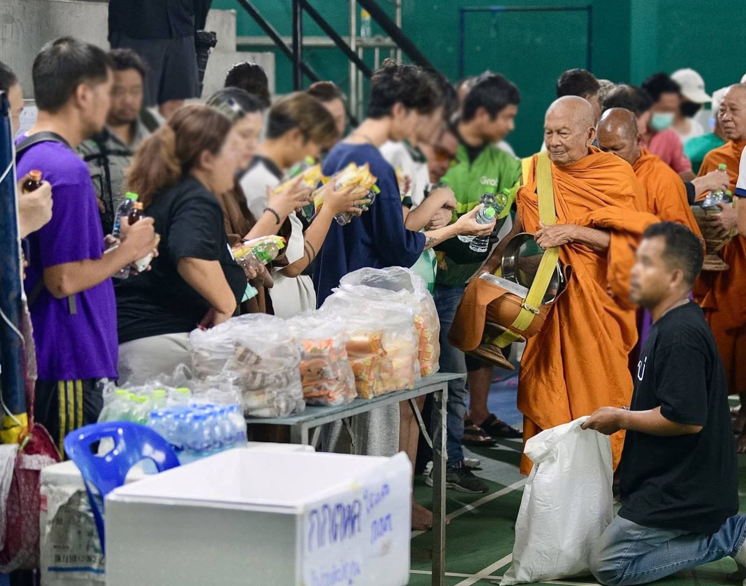 จากนั้นในเวลา 08.50 น. กลุ่มมวลชน จัดกิจกรรมทำบุญเชิงสัญลักษณ์นิมนต์พระสงฆ์ 9 รูป จากวัดใหญ่อินทาราม มายังโรงยิมอเนกประสงค์ เทศบาลเมืองชลบุรี เพื่ออุทิศส่วนกุศลให้กับคณะกรรมการการเลือกตั้ง (กกต.) และเป็นการเรียกร้องให้ กกต. เร่งตรวจสอบข้อร้องเรียน รวมถึงตัดสินใจให้เร็วขึ้น โดยระหว่างที่พระสงฆ์เดินบิณฑบาตอยู่นั้น พบกลุ่มมวลชนบางคนได้ ตั้งจิตขออธิษฐาน ขอให้มีการนับคะแนนใหม่ในวันนี้