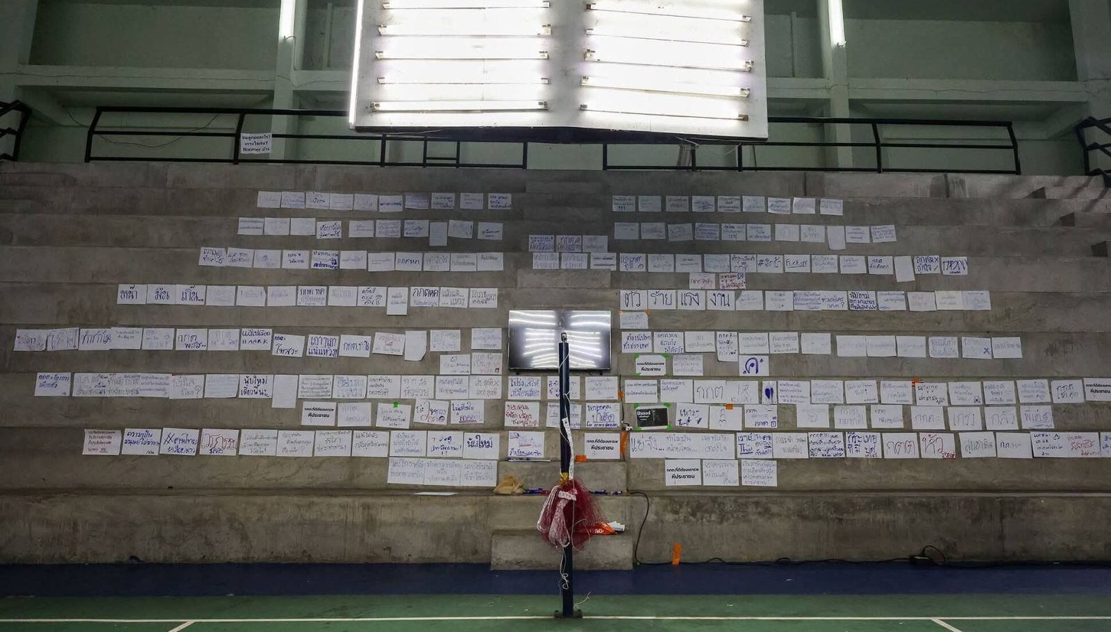 บริเวณอัฒจันทร์ซึ่งถูกใช้เป็นพื้นที่รวมตัวของกลุ่มมวลชนขึ้นปราศรัย มีการติดแผ่นกระดาษข้อความเรียกร้องความโปร่งใสกว่า 100 แผ่น เรียงรายเต็มแนวอัฒจันทร์ รวมถึงข้อความเสียดสีและตั้งคำถามต่อการทำงานของ กกต.