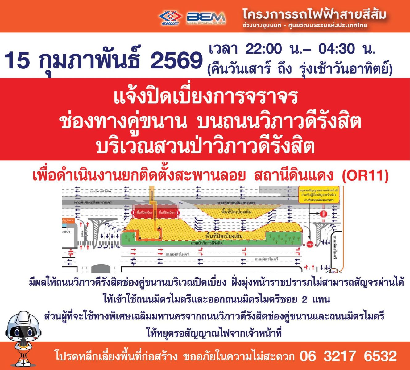 ประชาสัมพันธ์ แจ้งปิดเบี่ยงการจราจรช่องทางคู่ขนาน บนถนนวิภาวดีรังสิตบริเวณสวนป่าวิภาวดีรังสิต เพื่อดำเนินงานยกติดตั้งสะพานลอย สถานีดินแดง (OR11) โครงการรถไฟฟ้าสายสีส้ม ช่วงบางขุนนนท์ - ศูนย์วัฒนธรรมแห่งประเทศไทย ในวันคืนที่ 15 กุมภาพันธ์ 2569 เวลา 22:00 น.– 04:30 น. (#คืนวันเสาร์ถึงรุ่งเช้าวันอาทิตย์)