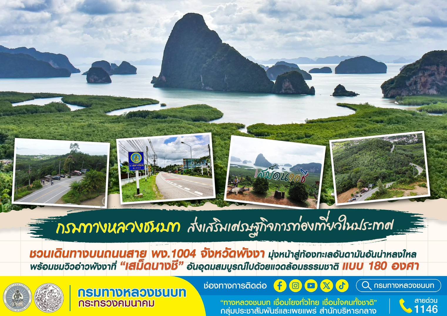 กรมทางหลวงชนบท (ทช.) ส่งเสริมเศรษฐกิจการท่องเที่ยวในประเทศ ชวนเดินทางบนถนนสาย พง.1004 จังหวัดพังงา มุ่งหน้าสู่ท้องทะเลอันดามันอันน่าหลงใหล พร้อมชมวิวอ่าวพังงาที่ “เสม็ดนางชี” อันอุดมสมบูรณ์ไปด้วยแวดล้อมธรรมชาติ แบบ 180 องศา