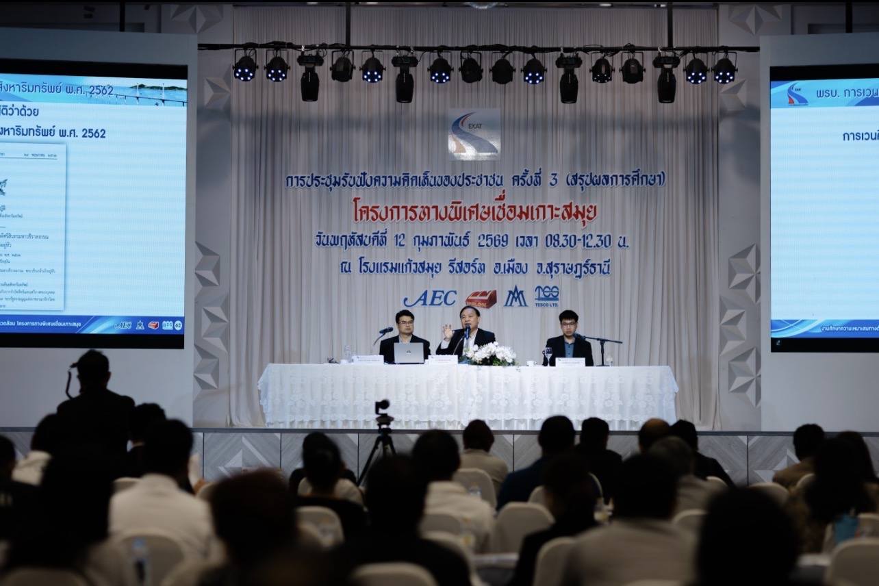 วันนี้ (12 กุมภาพันธ์ 2569) นางสาวณัฐฐา กาสี รองผู้ว่าการการทางพิเศษแห่งประเทศไทย (การเงิน บัญชี และพัฒนาธุรกิจ) ร่วมกับนายจุมพฏ วรรณฉัตรสิริ ผู้ว่าราชการจังหวัดสุราษฎร์ธานี เป็นประธานเปิดการประชุมรับฟังความคิดเห็นของประชาชน ครั้งที่ 3 (สรุปผลการศึกษา) งานศึกษาความเหมาะสมทางด้านวิศวกรรม เศรษฐกิจ การเงิน และผลกระทบสิ่งแวดล้อม โครงการทางพิเศษเชื่อมเกาะสมุย ณ ห้องประชุมคอนเวนชั่น 1 แก้วสมุย รีสอร์ท อำเภอเมือง จังหวัดสุราษฎร์ธานี โดยมีผู้เข้าร่วมการประชุมฯ จากหน่วยงานภาครัฐและเอกชน องค์กรปกครองส่วนท้องถิ่น ผู้นำชุมชน องค์กรเอกชน ด้านการคุ้มครองสิ่งแวดล้อมและอนุรักษ์ทรัพยากรธรรมชาติ ครอบคลุมผู้ได้รับผลกระทบ องค์กรพัฒนาเอกชน สถาบันการศึกษา นักวิชาการอิสระ สื่อมวลชน และประชาชนทั่วไปที่ให้ความสนใจ รวมถึงผู้เข้าร่วมรับฟังผ่านทางออนไลน์ประมาณ 180 คน