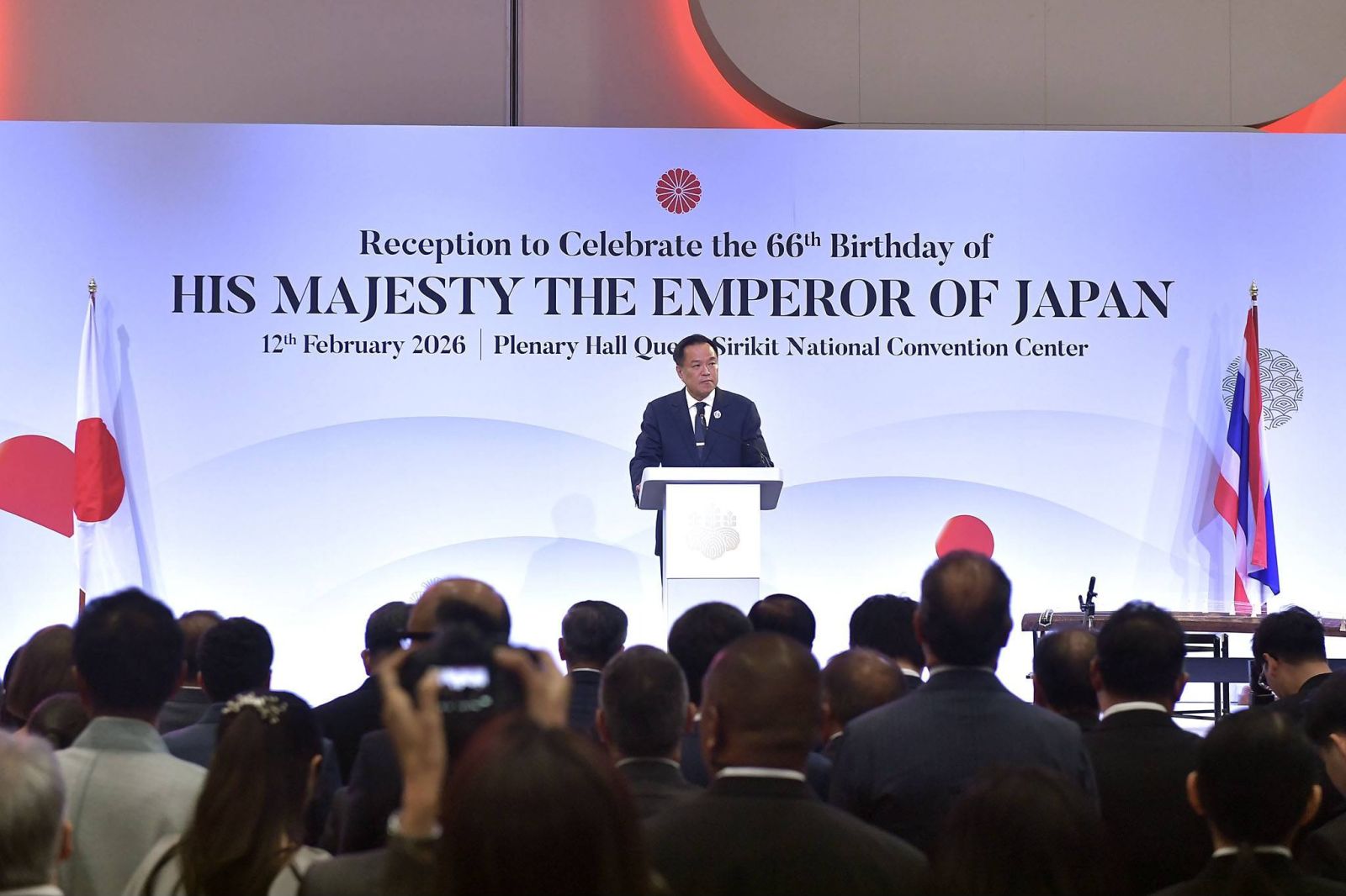 วันที่ 12 กุมภาพันธ์ 2569 ณ ห้องเพลนารีฮอลล์ ศูนย์การประชุมแห่งชาติสิริกิติ์ เขตคลองเตย กรุงเทพฯ นายอนุทิน ชาญวีรกูล นายกรัฐมนตรีและรัฐมนตรีว่าการกระทรวงมหาดไทย เข้าร่วมงานเลี้ยงรับรองเนื่องในโอกาสวันคล้ายวันพระราชสมภพของสมเด็จพระจักรพรรดิแห่งญี่ปุ่น โดยมีนายโอตากะ มาซาโตะ (H.E. Mr. OTAKA Masato) เอกอัครราชทูตญี่ปุ่นประจำประเทศไทยให้การต้อนรับ