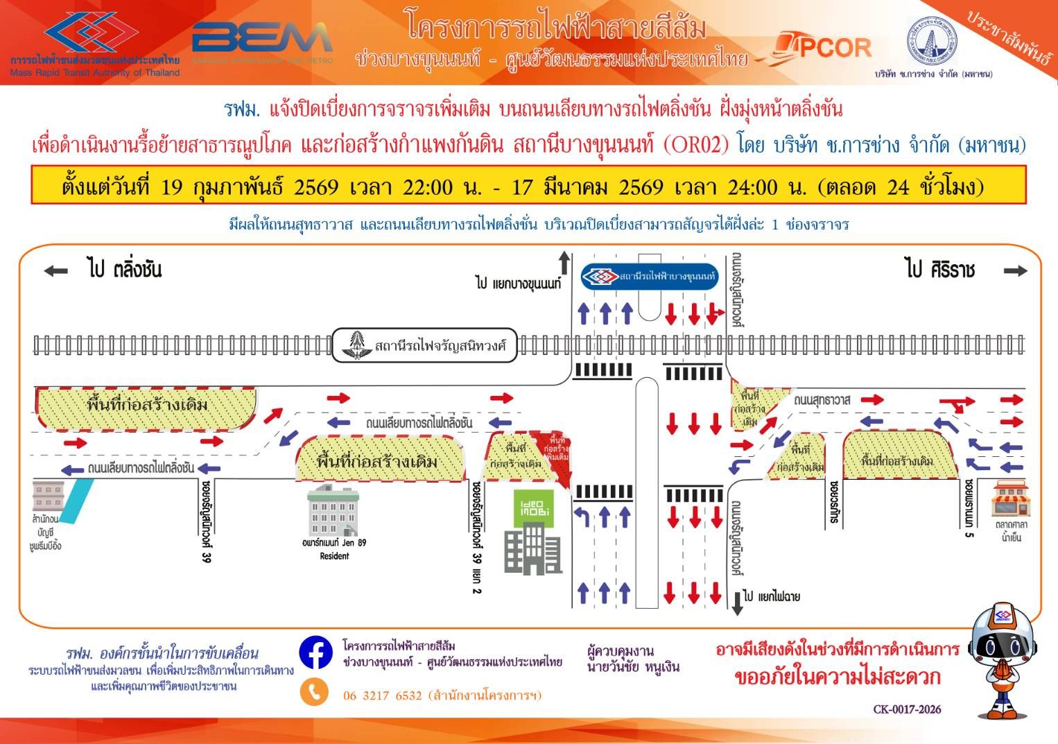 การรถไฟฟ้าขนส่งมวลชนแห่งประเทศไทย (รฟม.) แจ้งว่า บริษัท ช.การช่าง จำกัด (มหาชน) ผู้รับจ้างออกแบบและก่อสร้างอุโมงค์ทางวิ่งและสถานีใต้ดิน โครงการรถไฟฟ้าสายสีส้ม ช่วงบางขุนนนท์ – ศูนย์วัฒนธรรมแห่งประเทศไทย มีความจำเป็นต้องปิดเบี่ยงการจราจรเพิ่มเติม 2 ช่องจราจร บนถนนเลียบทางรถไฟตลิ่งชัน ฝั่งมุ่งหน้าตลิ่งชัน เพื่อดำเนินงานรื้อย้ายสาธารณูปโภค และก่อสร้างกำแพงกันดิน สถานีบางขุนนนท์ (OR02) ตั้งแต่วันที่ 19 กุมภาพันธ์ 2569 เวลา 22:00 น. – 17 มีนาคม 2569 เวลา 24:00 น. (ตลอด 24 ชั่วโมง) มีผลให้ถนนเลียบทางรถไฟตลิ่งชัน และ ถนนสุทธาวาส บริเวณปิดเบี่ยงสามารถสัญจรได้ฝั่งละ 1 ช่องจราจร โดยประชาชนสามารถเข้า – ออกที่พักอาศัยได้ตามปกติ