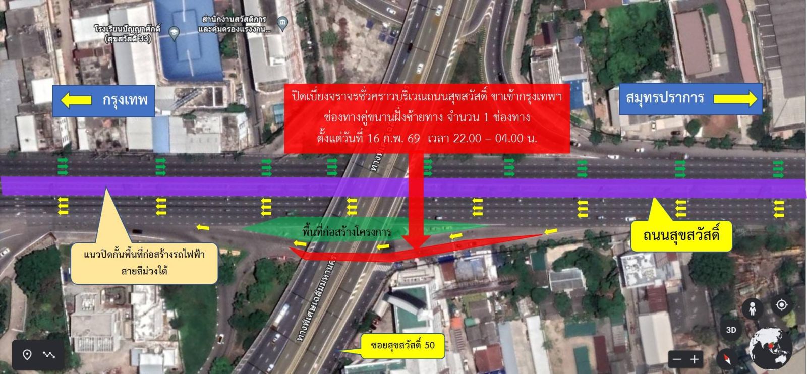 การทางพิเศษแห่งประเทศไทย (กทพ.) กระทรวงคมนาคมได้ว่าจ้าง กิจการร่วมค้า ไอทีดี-วีซีบี (ITD-VCB Joint Venture) ประกอบด้วย บริษัท อิตาเลียนไทย ดีเวล๊อปเมนต์ จำกัด (มหาชน) และบริษัท วิจิตรภัณฑ์ก่อสร้าง จำกัด เป็นผู้รับจ้างดําเนินการก่อสร้างโครงการทางพิเศษสายพระราม3 – ดาวคะนอง - วงแหวนรอบนอกกรุงเทพมหานครด้านตะวันตก สัญญาที่ 3 โดยโครงการฯ ขอแจ้งปิดเบี่ยงการจราจรชั่วคราว เพื่อติดตั้งกำแพงคอนกรีต บริเวณถนนสุขสวัสดิ์ ฝั่งขาเข้ากรุงเทพฯ จำนวน 1 ช่องจราจร บริเวณถนนสุขสวัสดิ์ บริเวณก่อนเข้าซอยสุขสวัสดิ์ 50 ถึงบริเวณก่อนทางขึ้นด่านสุขสวัสดิ์ (ช่วงใต้ทางด่วน) จำนวน 1 ช่องจราจร ตั้งแต่วันที่ 15-16 กุมภาพันธ์ 2569 เวลา 22.00 - 04.00 น.