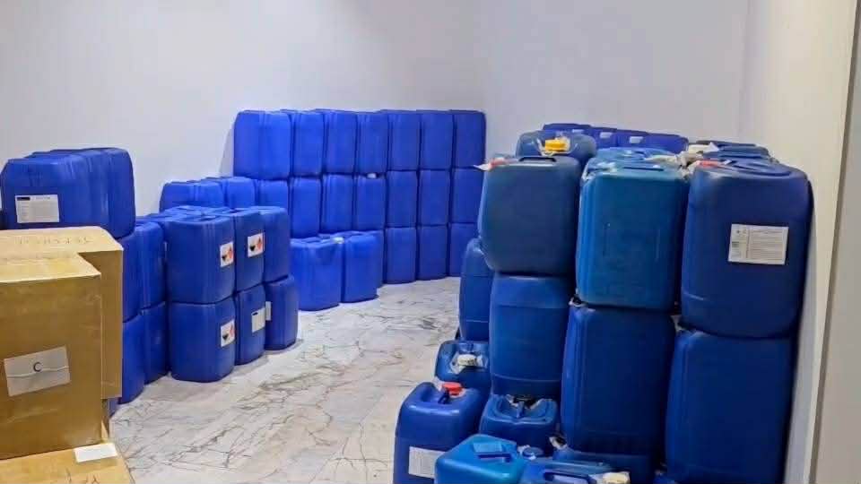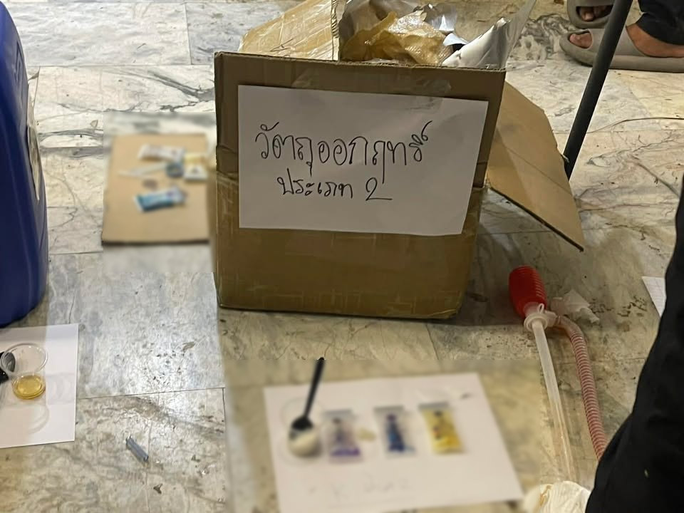 ภายในบ้าน เจ้าหน้าที่พบเครื่องสกัดสารเคมีแบบสารระเหยจำนวน 4 เครื่อง ตั้งอยู่กลางบ้าน และตรวจพบสารเคมีบรรจุแกลลอนสีฟ้าและถังปี๊ปรวมกว่า 50 ถัง กระจายอยู่ตามห้องต่างๆ เบื้องต้นเก็บตัวอย่างตรวจด้วยเครื่องตรวจของสำนักงาน ป.ป.ส. พบผลเป็นบวกในกลุ่มยาไอซ์และยาเคตามีน จึงประสานสาธารณสุขและศูนย์พิสูจน์หลักฐานเข้าตรวจพิสูจน์อย่างละเอียด