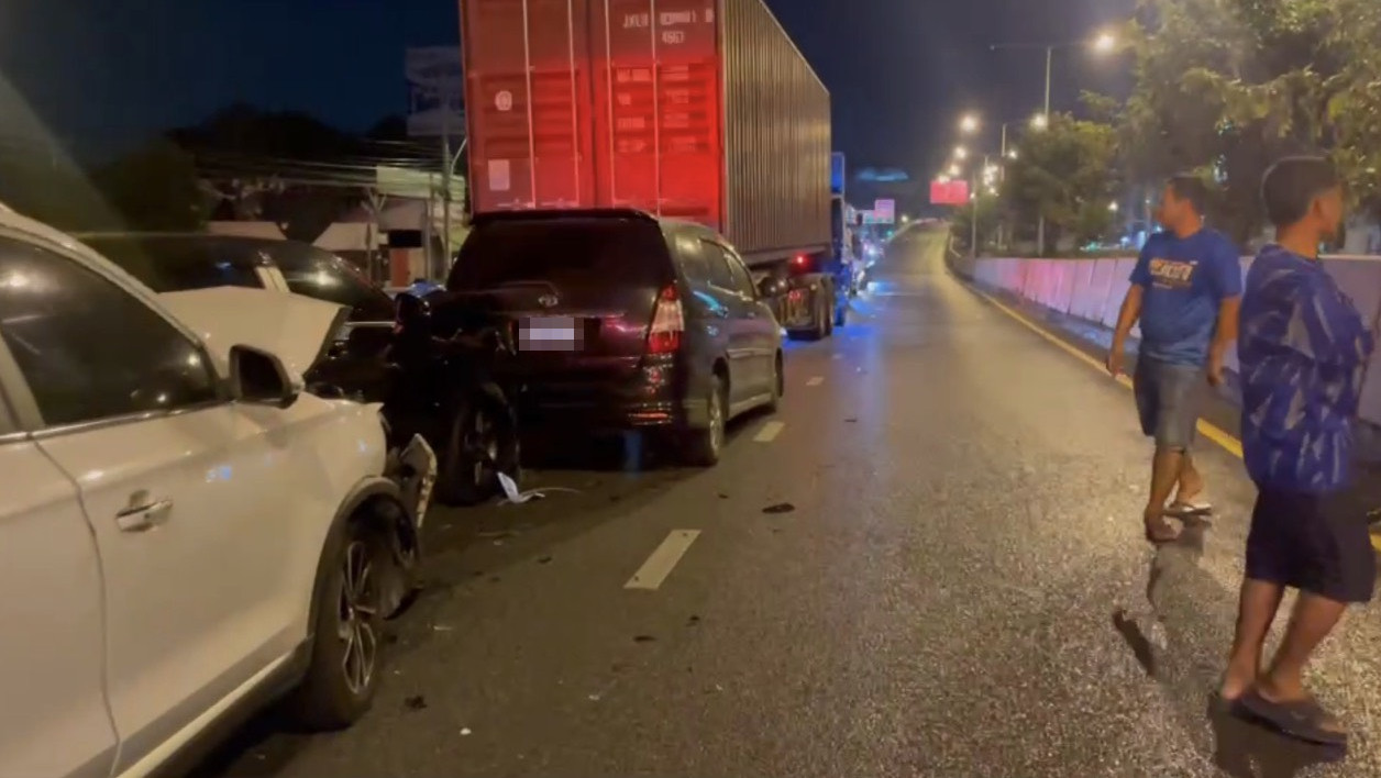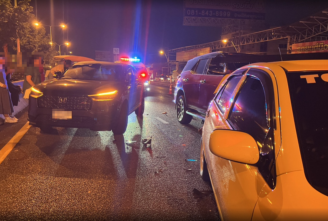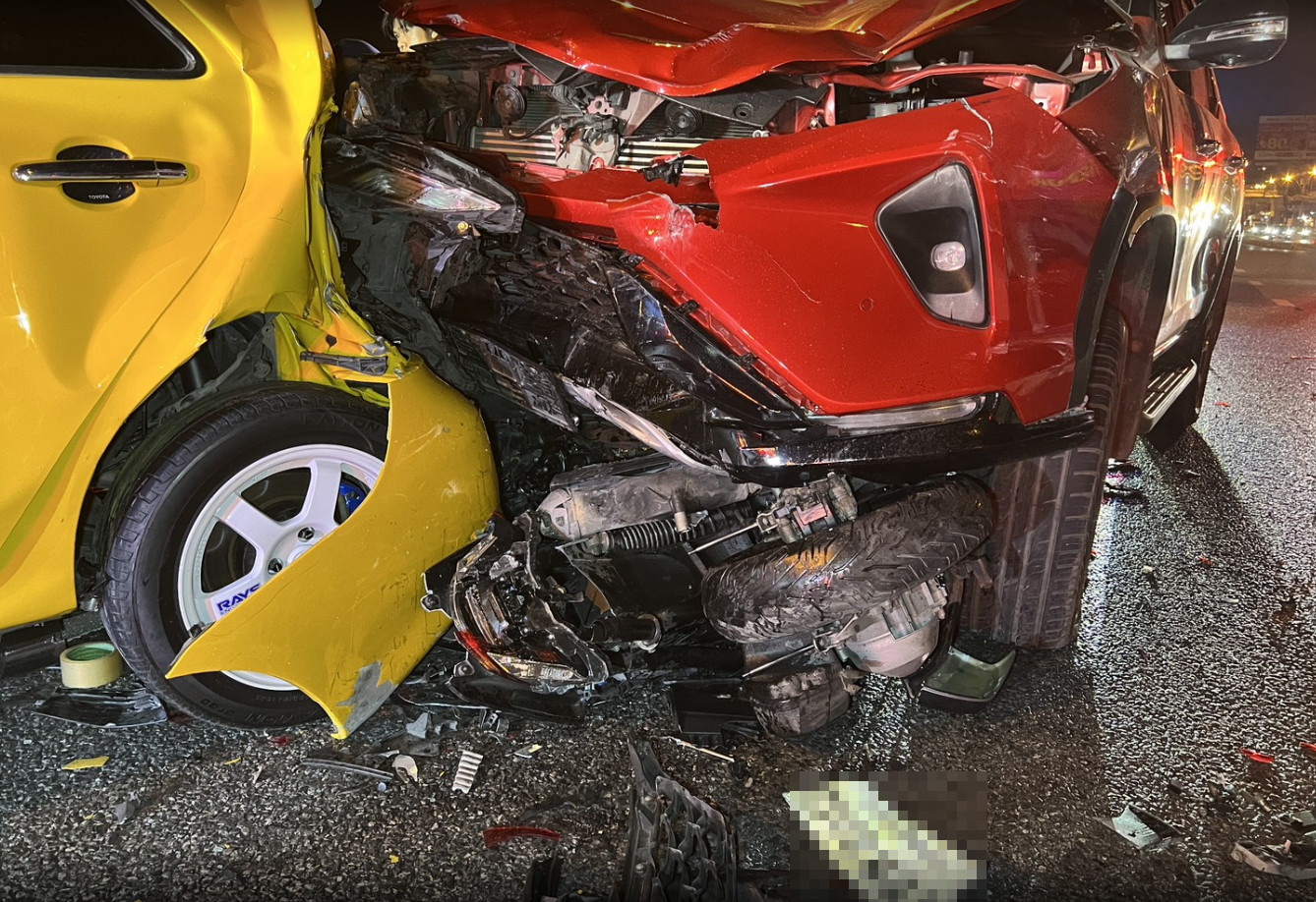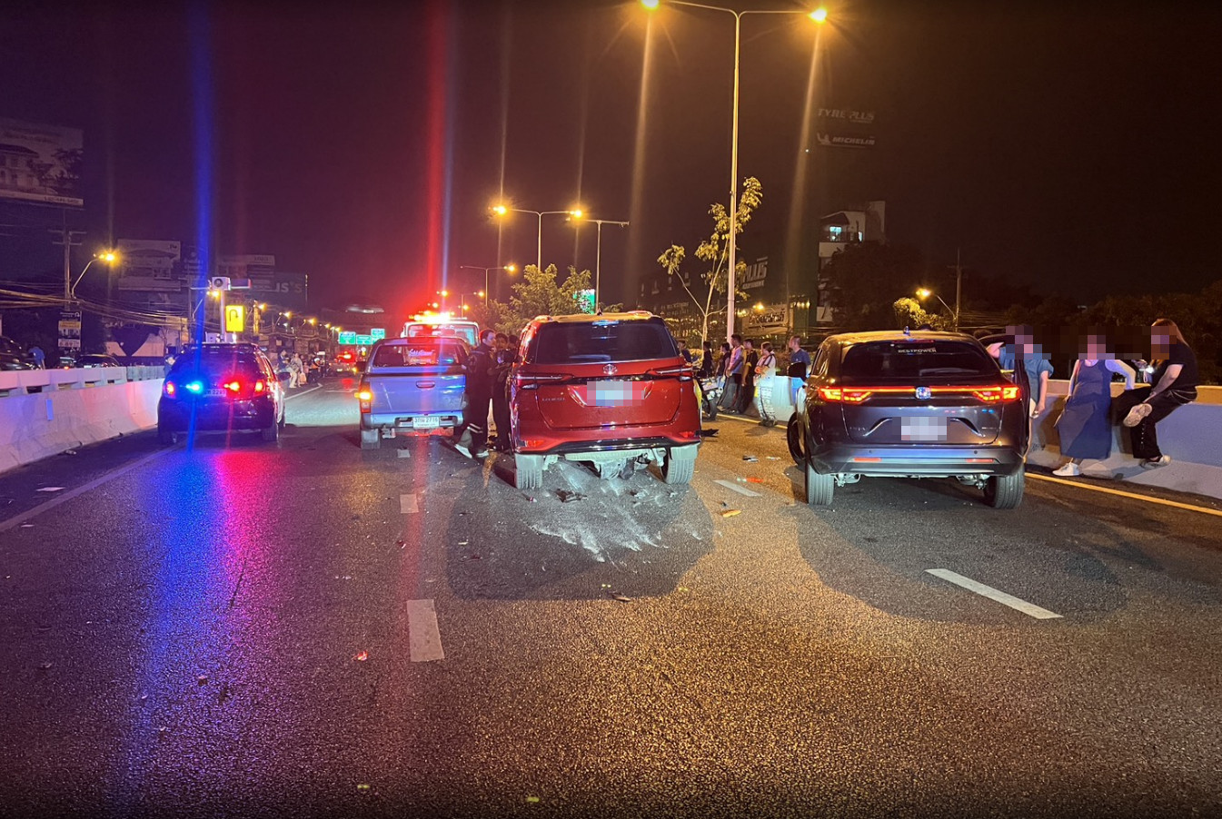 ด้านคนขับรถยนต์เก๋งยี่ห้อ โตโยต้า สีเหลือง ทะเบียน กทม.กล่าวว่า ก่อนหน้านี้มีอุบัติเหตุรถเก๋งชนท้ายรถบรรทุกพ่วงอยู่ก่อนแล้วรถทุกคันมีการชะลอตัวรวมถึงรถตนเองโดยขับไปอย่างช้าๆจู่ๆ ก็ถูกรถโตโยต้าฟอร์จูนเนอร์สีแดงที่มาด้วยความเร็วพุ่งชนท้ายรถตนเองและกระบะรวมถึงรถจักรยานยนต์ซ้ำอย่างแรง ทำให้มีผู้บาดเจ็บเป็นผู้ขับขี่รถโตโยต้าฟอร์จูนเนอร์ซึ่งเป็นผู้หญิง 1 ราย ส่วนอีก 1 รายเป็นชายขับขี่รถจักรยานยนต์