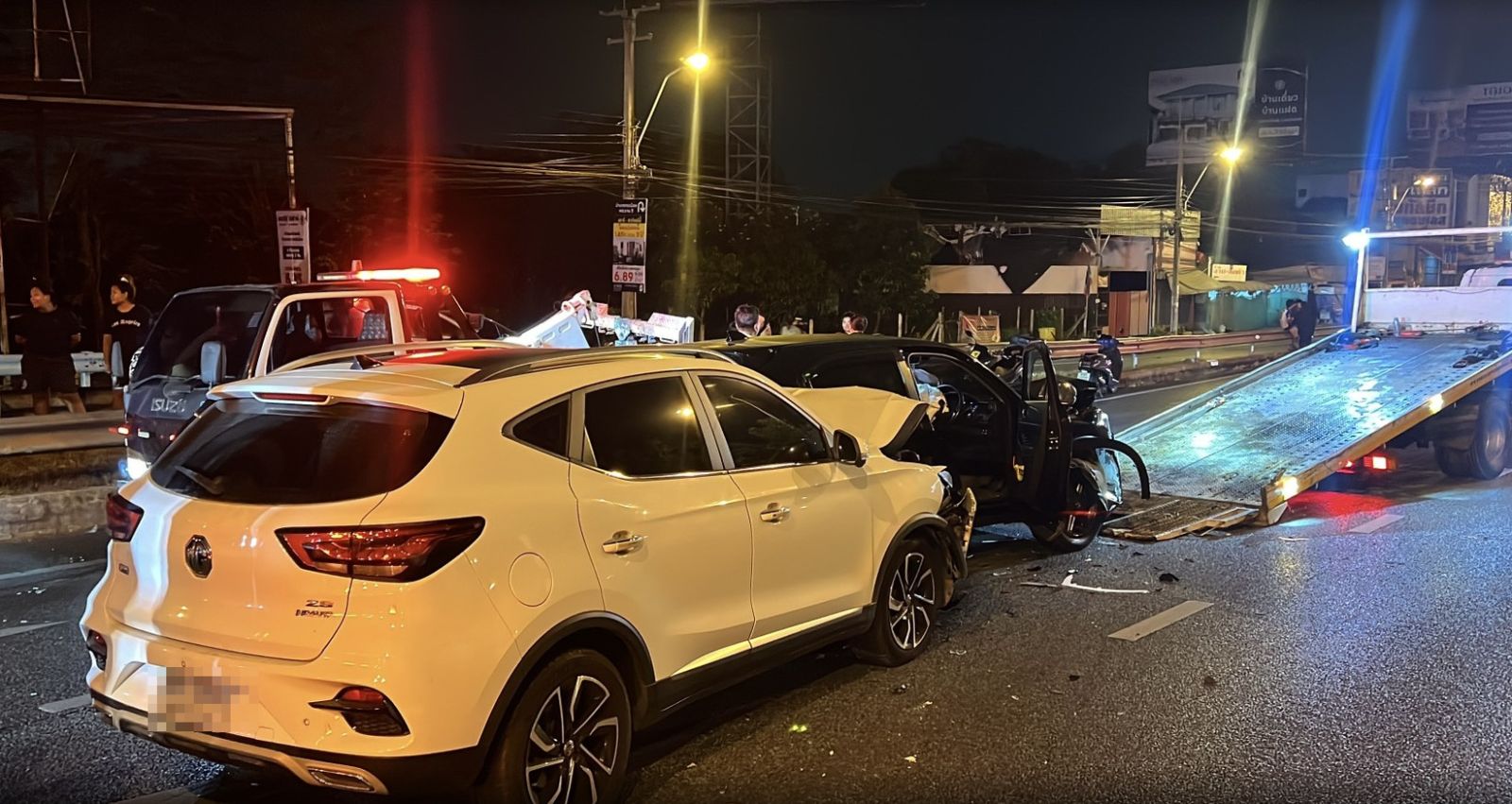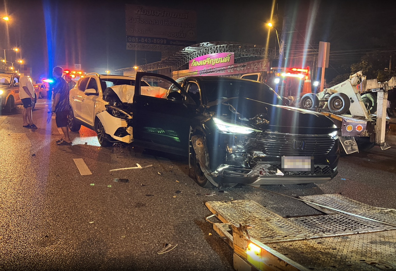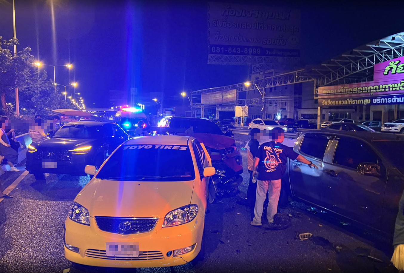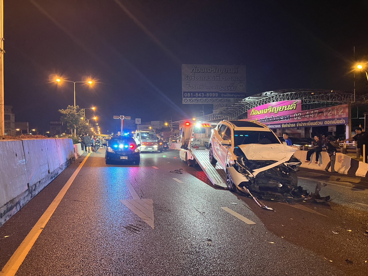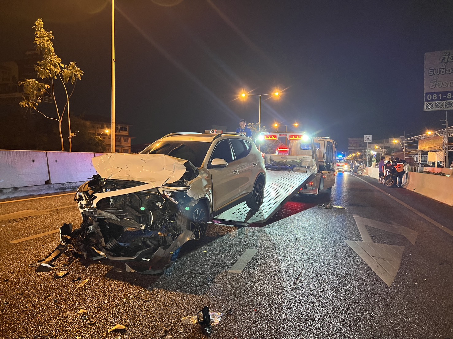 ที่เกิดพบรถบรรทุกพ่วง 18 ล้อยี่ห้อ ฮีโน่ ทะเบียน กทม. ที่ด้านท้ายถูกรถยนต์เก๋งอีก 3 คันลักษณะชนท้ายต่อกัน ใกล้เคียงยังพบรถจักรยานยนต์พ่วงข้างขายของล้มตะแคงพังเสียหาย และยังมีรถจักรยานยนต์อีก 1 คันพังเสียหายด้วย โดยเหตุการณ์นี้มีผู้บาดเจ็บที่มากับรถเก๋งเป็นหญิง 2 รายและ จักรยานยนต์พ่วงข้างเป็นชาย 1 รายรถจักรยานยนต์เป็นชาย 1 รายรวม 4 ราย ห่างออกไปประมาณ 50 เมตรพบรถยนต์เก๋ง กระบะ และจักรยานยนต์รวม 4 ค้นมีผู้บาดเจ็บอีก 2 ราย รวมเหตุการณ์นี้มีผู้บาดเจ็บทั้งหมด 6 ราย รถเสียหายทั้งหมด 10 คันเจ้าหน้าที่กู้ภัยช่วยเหลือนำตัวส่งคนเจ็บส่งโรงพยาบาลอย่างเร่งด่วน หลังเกิดเหตุทางเจ้าหน้าที่ต้องเร่งทำการเคลื่อนย้ายรถทั้งหมดและเปิดการจราจรโดยใช้เวลานานกว่า 2 ชั่วโมง ขณะเดียวกันกล้องวงจรปิดสามารถบันทึกภาพเหตุการณ์ได้วินาทีที่รถจักรยานยนต์เฉี่ยวชนรถจักรยานยนต์พ่วงข้างขายของทำให้เกิดเหตุรถเก๋งชนท้ายรถบรรทุกพ่วงซ้ำซ้อนอย่างรุนแรง