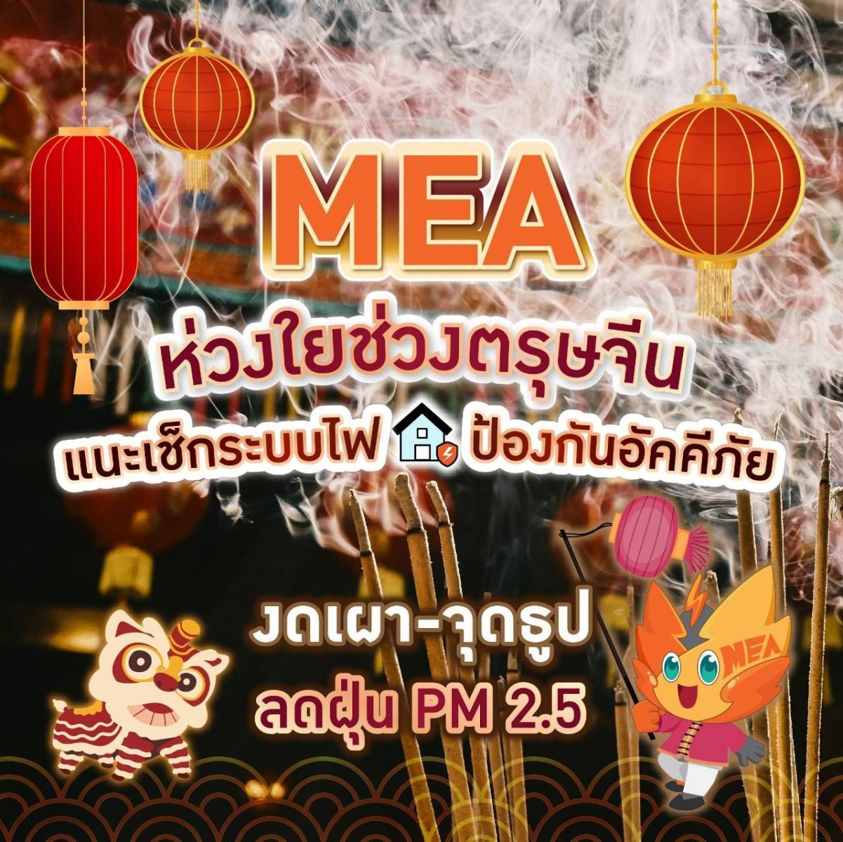 MEA ห่วงใยความปลอดภัยและสุขภาพประชาชนช่วงตรุษจีน 2569 เตือนภัยเงียบจากไฟฟ้าลัดวงจรและฝุ่นพิษ แนะวิธีเช็กระบบไฟให้ปลอดภัย พร้อมขอความร่วมมือ "ลด-ละ-เลิก" การจุดธูปและเผากระดาษ เพื่อลดค่าฝุ่น PM 2.5 สร้างอากาศบริสุทธิ์ให้เมืองมหานคร
