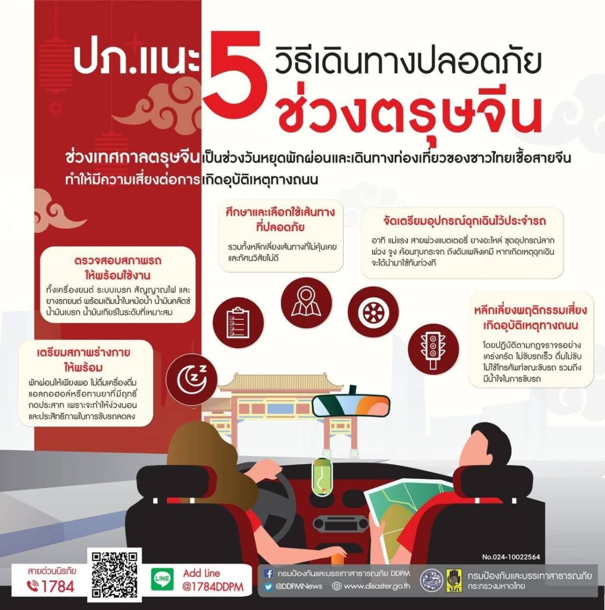 ขอให้เตรียมร่างกายให้พร้อม พักผ่อนให้เพียงพอ หลีกเลี่ยงดื่มเครื่องดื่มแอลกอฮอล์และทานยาที่ทำให้ง่วงซึม หากเดินทางไกลควรหยุดพักเป็นระยะ ทุกๆ 2 ชั่วโมง เพื่อลดความเสี่ยงจากอาการหลับใน พร้อมตรวจเช็กสภาพรถ ทั้งระบบเบรก ยางรถยนต์ และสัญญาณไฟ ให้พร้อมใช้งาน และเตรียมอุปกรณ์ฉุกเฉินไว้ติดรถ และเตรียมวางแผนในการเดินทาง ศึกษาสภาพเส้นทางการจราจจากรแอปพลิเคชันนำทาง (GPS Navigator) โดยเลือกใช้เส้นทางที่ปลอดภัย หลีกเลี่ยงเส้นทางที่ชำรุดหรือทัศนวิสัยไม่ดี อีกทั้งปฏิบัติตามกฎจราจรอย่างเคร่งครัด ไม่ขับรถเร็ว ไม่ใช้โทรศัพท์ขณะขับรถ คาดเข็มขัดนิรภัยทุกที่นั่ง และมีน้ำใจต่อผู้ร่วมใช้ถนน รวมถึงเพิ่มความระมัดระวังเมื่อสัญจรผ่านพื้นที่จัดงานหรือแหล่งที่มีคนพลุกพล่าน การขับขี่ด้วยความมีสติ ไม่ประมาท และเคารพกฎจราจร จะช่วยลดความสูญเสียและทำให้การเริ่มต้นปีใหม่ของชาวไทยเชื้อสายจีนเป็นไปด้วยความสุขและปลอดภัย