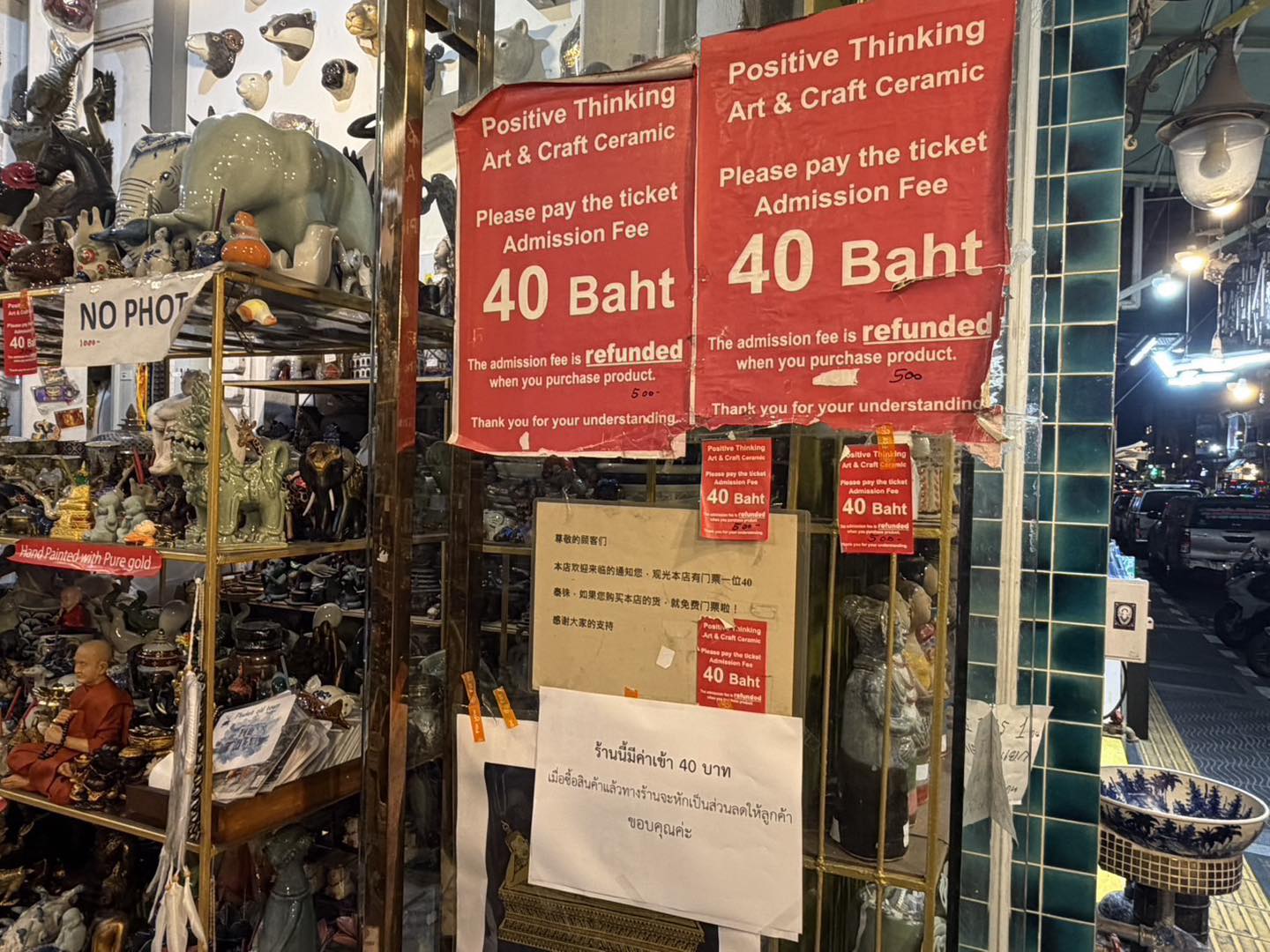จากการตรวจสอบพบว่า ผู้ประกอบการได้ติดป้ายแสดงราคาสินค้า พร้อมรายละเอียดเงื่อนไขค่าบริการอย่างชัดเจน โดยมีการแจ้งค่าบริการเข้าร้าน 40 บาท และระบุว่าเมื่อลูกค้าซื้อสินค้า สามารถนำค่าบริการดังกล่าวไปหักเป็นส่วนลดได้ ทั้งนี้ ป้ายแสดงข้อมูลมีทั้งภาษาไทย ภาษาอังกฤษ และภาษาจีน ติดบริเวณประตูทางเข้าร้านอย่างชัดเจน