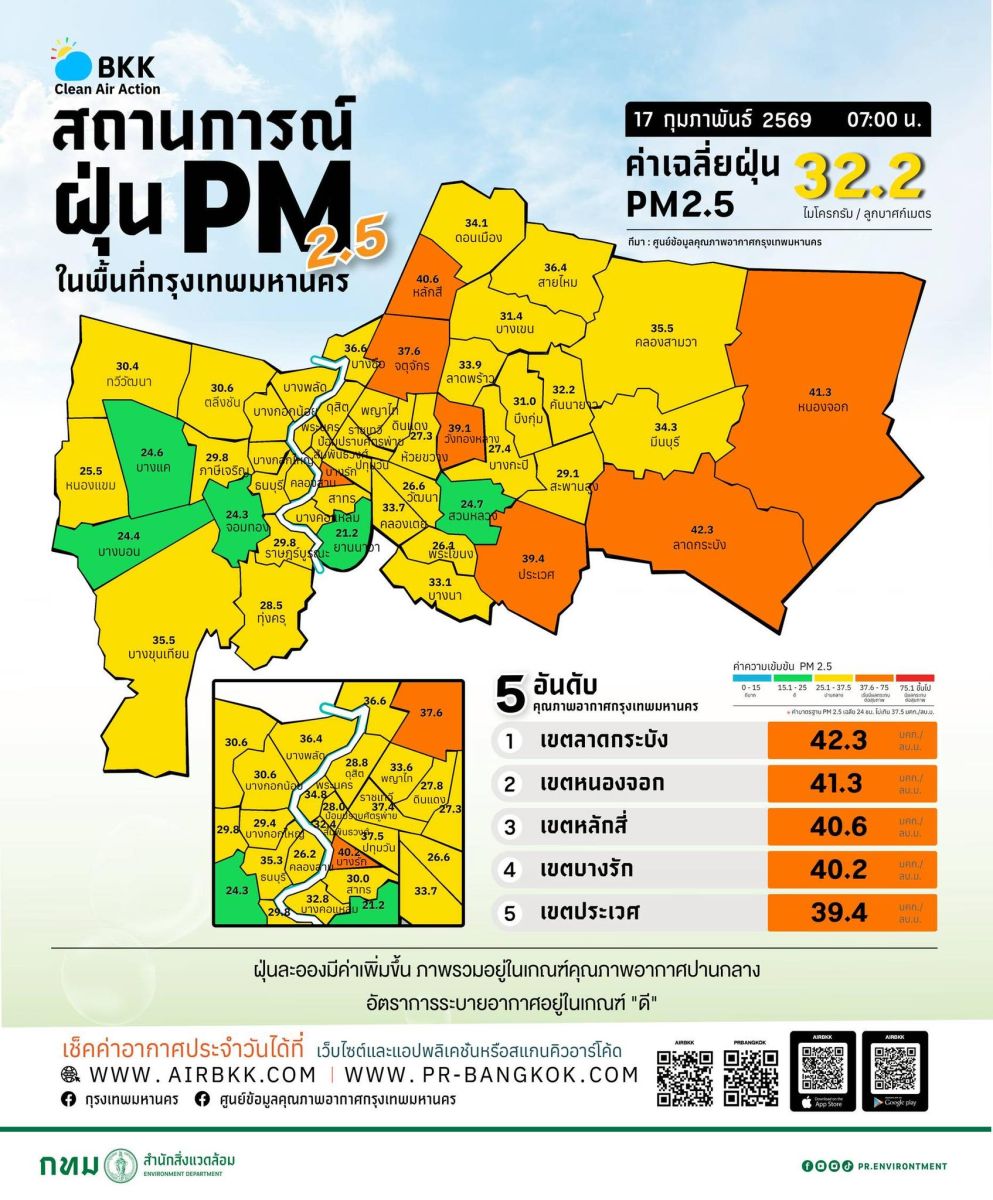 ศูนย์ข้อมูลคุณภาพอากาศกรุงเทพมหานคร ขอรายงานสถานการณ์ฝุ่นละอองขนาดไม่เกิน 2.5 ไมครอน (PM 2.5) ในกรุงเทพมหานคร ประจำวันที่ 17 กุมภาพันธ์ 2569 เวลา 07:00 น. ค่าเฉลี่ยของกรุงเทพมหานครื32.2 มคก./ลบ.ม. (ค่ามาตรฐาน 37.5 มคก./ลบ.ม.)