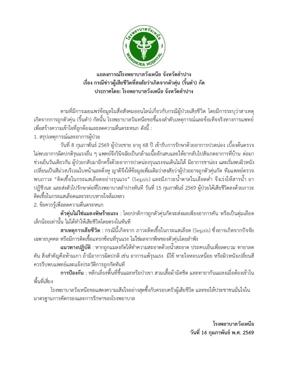 โรงพยาบาลวังเหนือ ลำปาง แจงเคสชายวัย 68 ปี เสียชีวิตจากติดเชื้อรุนแรง หลังถูกตัวคุ่น (ริ้นดำ) กัด
