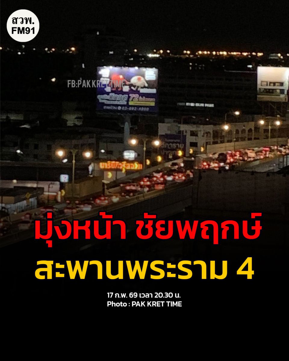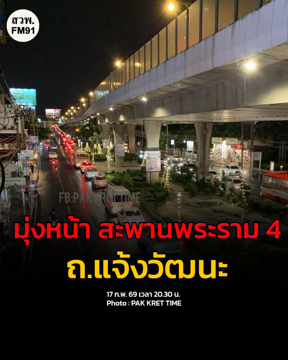 17 ก.พ. 69 เวลา 20.20 น. จากฝนตกหนัก! สะพานพระราม 4 ขาออก มุ่งหน้าชัยพฤกษ์ ช่วงเหนือวัดบ่อ มีน้ำท่วมขัง 2 เลนซ้าย