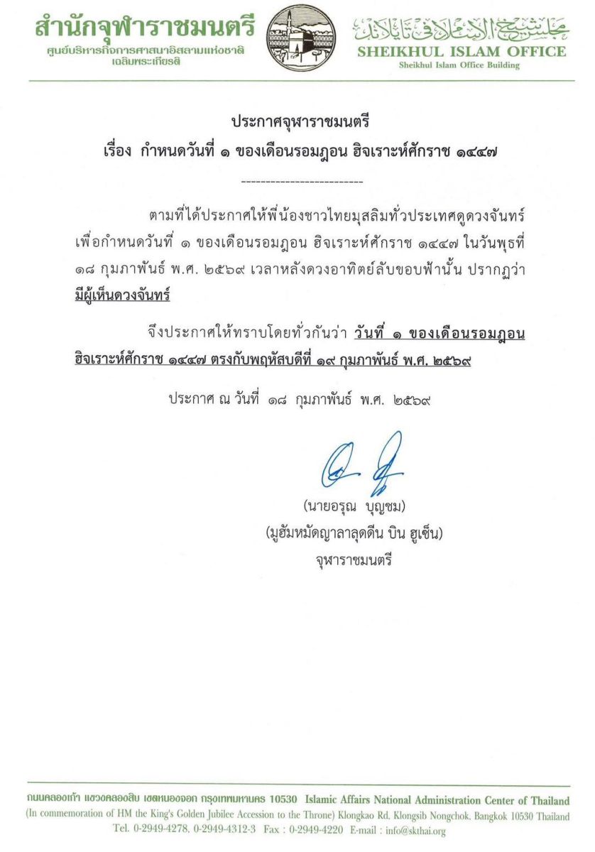 จุฬาราชมนตรี ประกาศให้ วันที่ 1 เดือนรอมฎอน ฮิจเราะห์ศักราช 1447 ตรงกับวันพฤหัสบดีที่ 19 กุมภาพันธ์ 2569