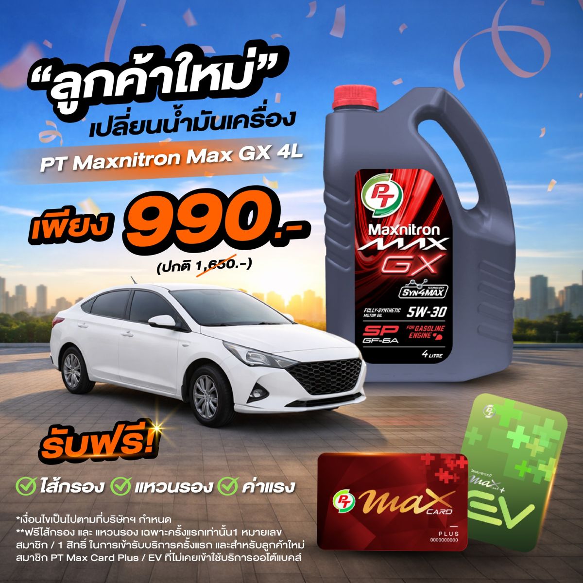 - ลูกค้าใหม่ เปลี่ยนน้ำมันเครื่อง PT Maxnitron Max GX 4L ลดเหลือเพียง 990 บาท (จากปกติ 1,650 บาท) และรับฟรี ไส้กรอง แหวนรอง และค่าแรง