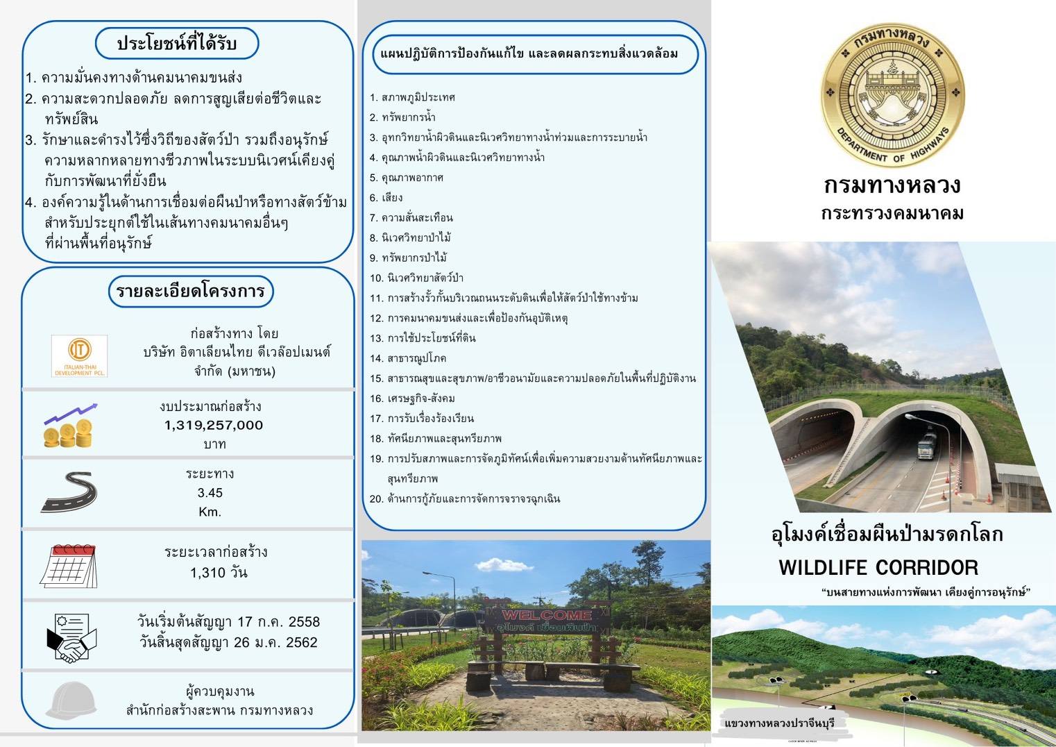 ทั้งนี้ โครงการดังกล่าวเป็นการบูรณาการร่วมกันระหว่างกรมทางหลวง กระทรวงทรัพยากรธรรมชาติและสิ่งแวดล้อม และหน่วยงานด้านการอนุรักษ์ทรัพยากรธรรมชาติและสิ่งแวดล้อม เพื่อพัฒนาโครงสร้างพื้นฐานควบคู่กับการคุ้มครองระบบนิเวศอย่างสมดุล