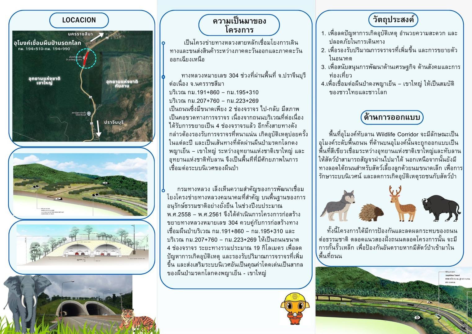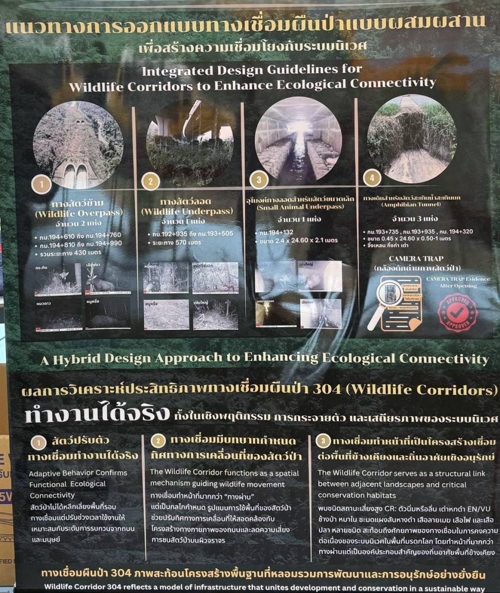 ในการนี้ กรมทางหลวงได้รายงานแนวคิดการก่อสร้างอุโมงค์เชื่อมผืนป่า บนทางหลวงหมายเลข 304 ซึ่งเป็นเส้นทางหลักที่ตัดผ่านพื้นที่อุทยานแห่งชาติเขาใหญ่และอุทยานแห่งชาติทับลาน ซึ่งเป็นพื้นที่ป่ามรดกโลก โดยออกแบบเป็นอุโมงค์ระดับพื้นถนน และจัดให้มีพื้นที่ด้านบนเป็นทางเชื่อมให้สัตว์ป่าสามารถสัญจรได้อย่างปลอดภัย สอดคล้องกับสภาพพื้นที่และพฤติกรรมสัตว์ป่า