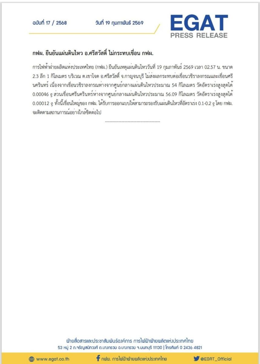 การไฟฟ้าฝ่ายผลิตแห่งประเทศไทย (กฟผ.) ยืนยันเหตุแผ่นดินไหววันที่ 19 กุมภาพันธ์ 2569 เวลา 02.57 น. ขนาด2.3 ลึก 1 กิโลเมตร บริเวณ ต.เขาโจด อ.ศรีสวัสดิ์ จ.กาญจนบุรี ไม่ส่งผลกระทบต่อเขื่อนวชิราลงกรณและเขื่อนศรีนครินทร์