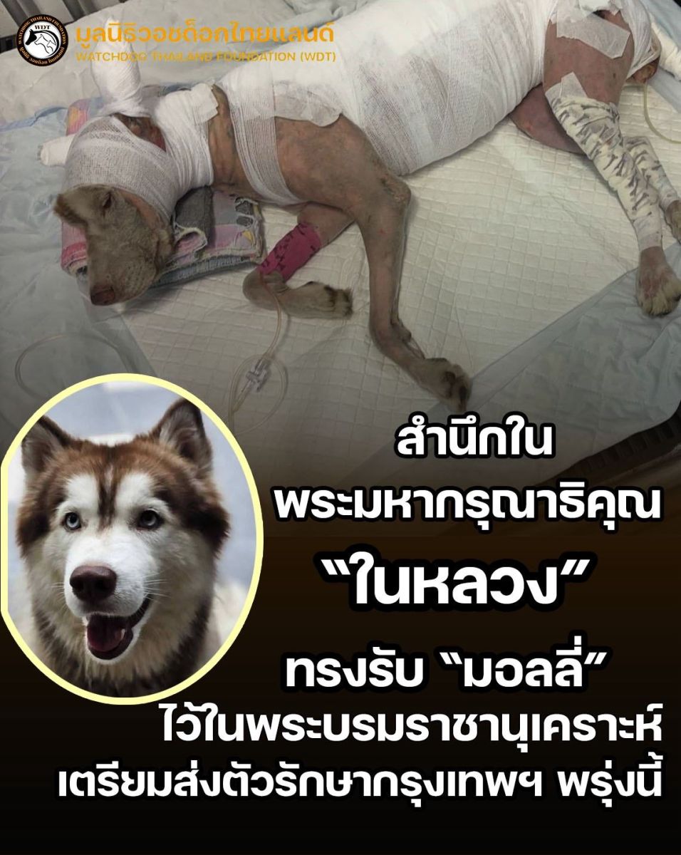 เมื่อ พระบาทสมเด็จพระวชิรเกล้าเจ้าอยู่หัว ทรงมีพระเมตตารับ “มอลลี่” ไว้ในพระบรมราชานุเคราะห์ หลังจากน้องไซบีเรียนวัยเพียง 2 ขวบ ถูกทำร้ายอย่างโหดร้ายที่จังหวัด สงขลา จนอาการสาหัส ราชเลขานุการในพระองค์จะเดินทางมารับมอลลี่ที่สงขลา เพื่อพาเข้ารับการรักษาต่อที่กรุงเทพมหานครในวันพรุ่งนี้ (20 กุมภาพันธ์ 2569) ท่ามกลางความสูญเสียและความสะเทือนใจของสังคม พระเมตตาครั้งนี้ คือความหวังครั้งใหญ่ของชีวิตเล็ก ๆ หนึ่งชีวิต ขอให้มอลลี่เข้มแข็ง และขอให้ปาฏิหาริย์เกิดขึ้นอีกครั้ง