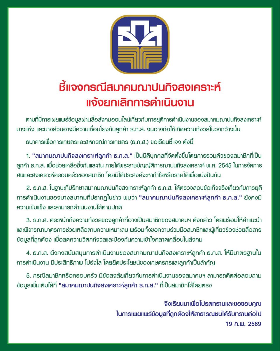 ตามที่มีการเผยแพร่ข้อมูลผ่านสื่อสังคมออนไลน์เกี่ยวกับการยุติการดําเนินงานของสมาคมฌาปนกิจสงเคราะห์บางแห่ง และบางส่วนอาจมีความเชื่อมโยงกับลูกค้า ธ.ก.ส. จนอาจก่อให้เกิดความกังวลในวงกว้างนั้น ธนาคารเพื่อการเกษตรและสหกรณ์การเกษตร (ธ.ก.ส.) ขอเรียนชี้แจง ดังนี้