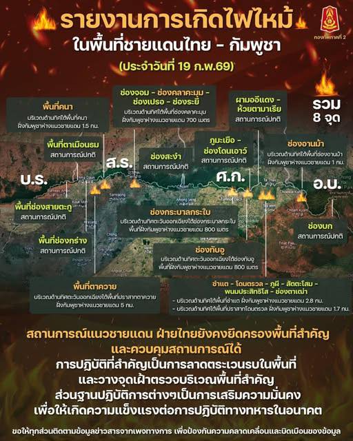 วันที่ 19 กุมภาพันธ์ 2569 กองทัพภาคที่ 2 สรุปสถานการณ์ไฟป่าบริเวณแนวชายแดนไทย-กัมพูชา ประจำวันที่ 19 ก.พ. 69 รวม 8 จุด