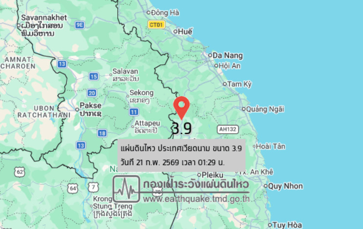 วันที่ 21 ก.พ. 2569 เวลา 01:29 น. กองเฝ้าระวังแผ่นดินไหว กรมอุตุนิยมวิทยา แจ้งเหตุ แผ่นดินไหว ขนาด 3.9 ความลึก 4 กม. ภายในพื้นที่ของประเทศเวียดนาม (14.93°N,107.70°E) ศูนย์กลางห่างออกไป ทางทิศตะวันออกเฉียงใต้ของ อ.เมือง จ.อุบลราชธานี ประมาณ 308 กม. ยังไม่มีรายงานผลกระทบต่อประเทศไทย