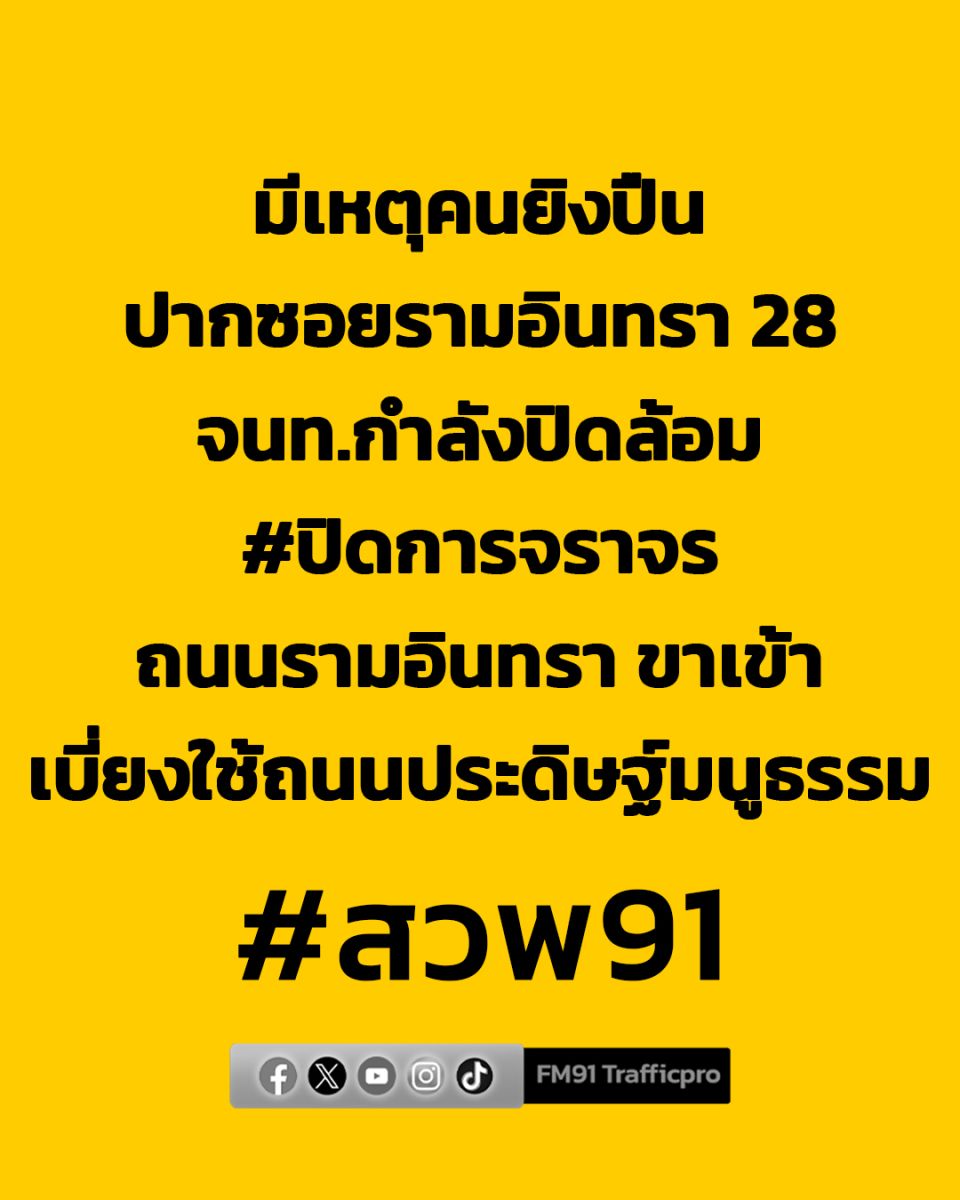 (21 ก.พ.68) จากกรณีผู้ใช้เส้นทางสอบถามผ่านหมายเลขโทรฟรี 1644 สวพ.FM91 ระบุว่าถนนรามอินทรา ขาเข้า ช่วงต่างระดับวัชรพล การจราจรติดขัดมาก มีเหตุใดหรือไม่ ทีมงานตรวจสอบข้อมูลจากศูนย์วิทยุผ่านฟ้า ตำรวจ 191 และศูนย์วิทยุประชาราษฎร์ บก.น.2 รายงานว่าเมื่อเวลาประมาณ 02.00 น. ได้รับแจ้งว่ามีเหตุคนยิงปืนออกจากอาคารพาณิชย์ ใกล้เคียงปากซอยรามอินทรา 28 เจ้าหน้าที่ตรวจสอบได้ยิงเสียงคล้ายอาวุธปืนถูกยิงออกจากอาคารพาณิชย์ดังกล่าวเป็นระยะ จึงได้ดำเนินการตามขั้นตอน