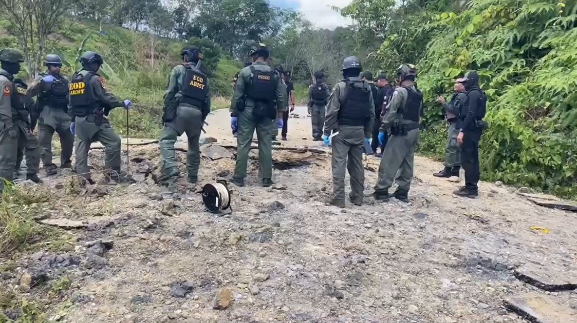 วันที่ 22 กุมภาพันธ์ 2569 เจ้าหน้าที่เร่งเข้าตรวจสอบและเคลียร์พื้นที่เหตุลอบวางระเบิดบนถนนมุ่งหน้าหมู่บ้านไอร์จะเซ็ง หมู่ 6 ต.ดุซงญอ อ.จะแนะ จ.นราธิวาส หลังคนร้ายจุดชนวนระเบิดเมื่อวันที่ 21 กุมภาพันธ์ที่ผ่านมา