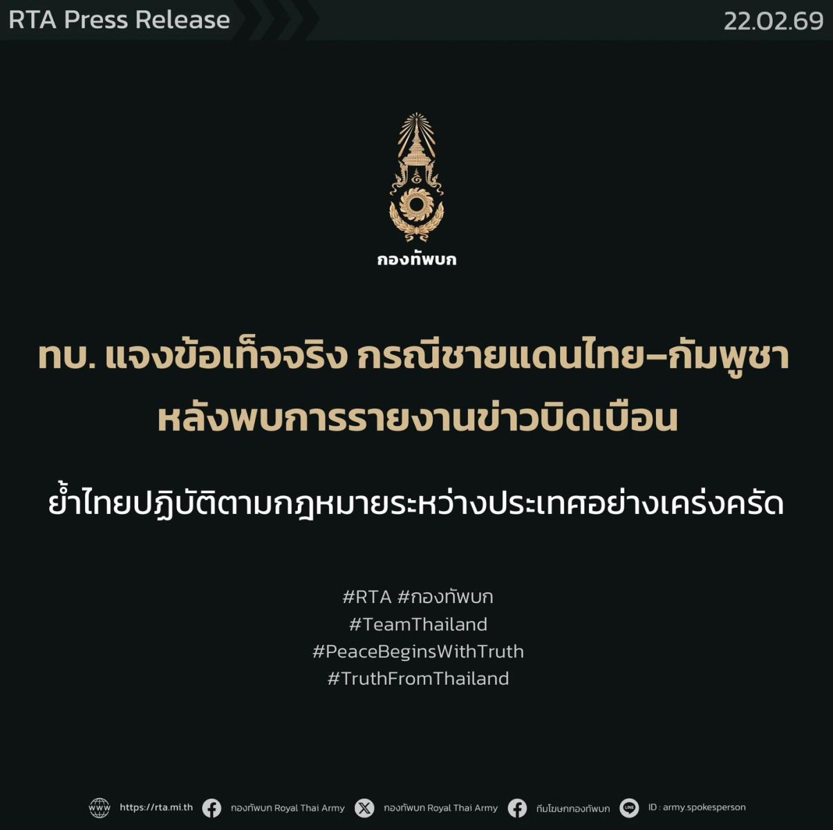 ทบ. แจงข้อเท็จจริง กรณีชายแดนไทย–กัมพูชา หลังพบการรายงานข่าวบิดเบือน ย้ำไทยปฏิบัติตามกฎหมายระหว่างประเทศอย่างเคร่งครัด
