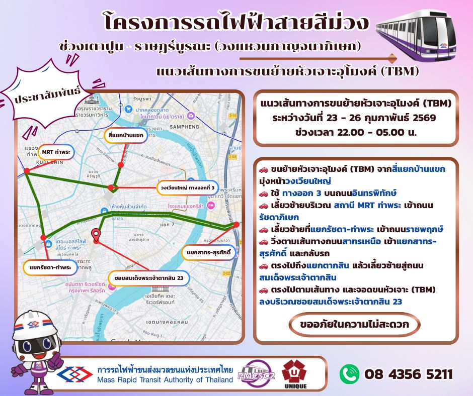 โครงการรถไฟฟ้าสายสีม่วงฯ เผยเส้นทางขนย้าย หัวเจาะอุโมงค์(TBM) คืนวันที่ 23 - 26 ก.พ.69 โครงการรถไฟฟ้าสายสีม่วง ช่วงเตาปูน - ราษฎร์บูรณะ (วงแหวนกาญจนาภิเษก) แนวเส้นทางการขนย้ายหัวเจาะอุโมงค์ (TBM) วันที่ 23 - 26 กุมภาพันธ์ 2569 ช่วงเวลา 22.00 - 05.00 น.