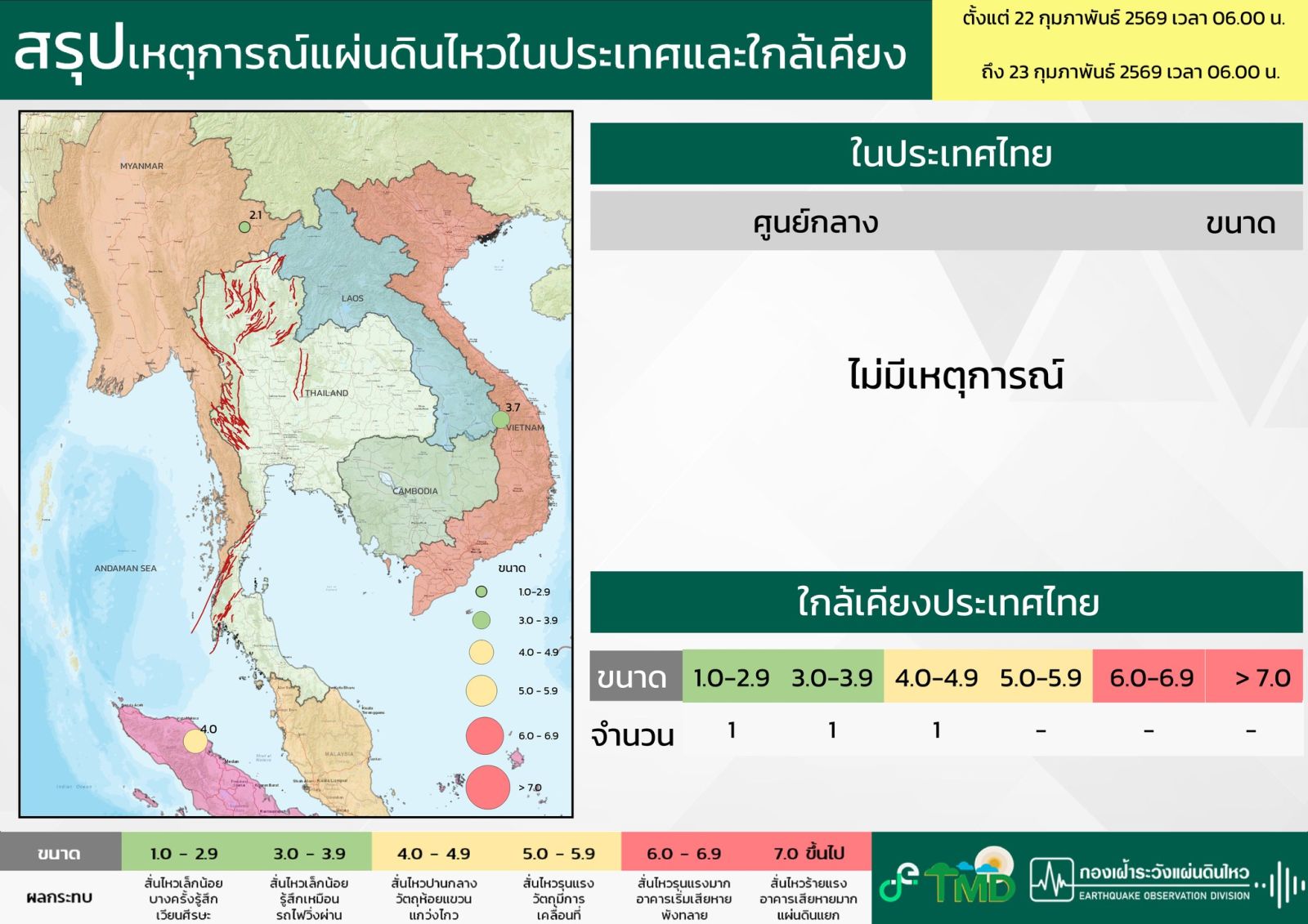 ล่าสุด เพจ “Earthquake TMD” แจ้งสรุปเหตุการณ์แผ่นดินไหวในประเทศและใกล้เคียง ตั้งแต่วันที่ 22 กุมภาพันธ์ 2569 เวลา 06.00 น. ถึง วันที่ 23 กุมภาพันธ์ 2569 เวลา 06.00 น.
