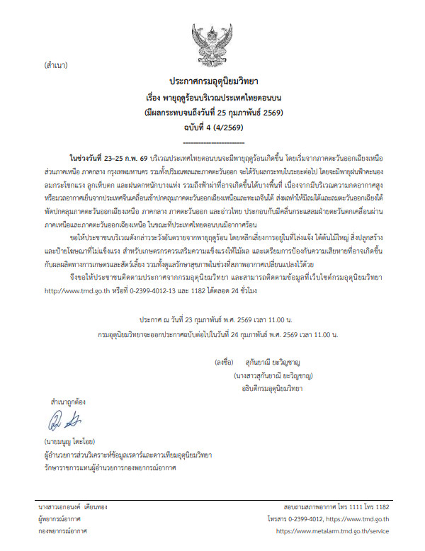 ประกาศกรมอุตุนิยมวิทยา เรื่อง พายุฤดูร้อนบริเวณประเทศไทยตอนบน (มีผลกระทบจนถึงวันที่ 25 กุมภาพันธ์ 2569) ฉบับที่ 4 (4/2569)