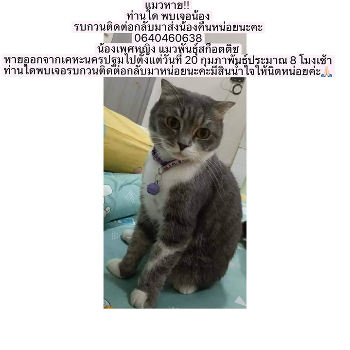 ตามหา "อชิจะ" แมวพันธุ์สก็อตติช เพศเมีย หายไปจากเคหะนครปฐม เวลา 08.00 น. วันที่ 20 ก.พ. 69