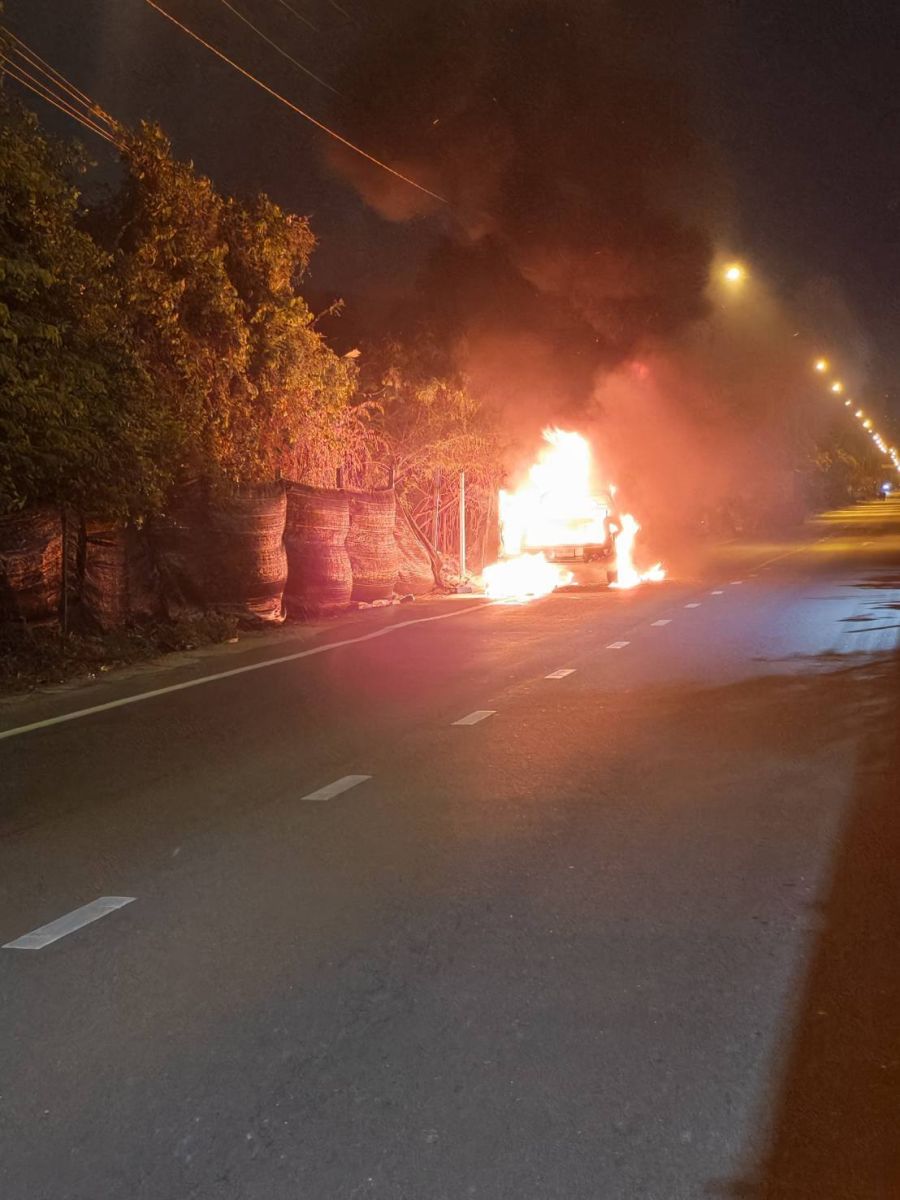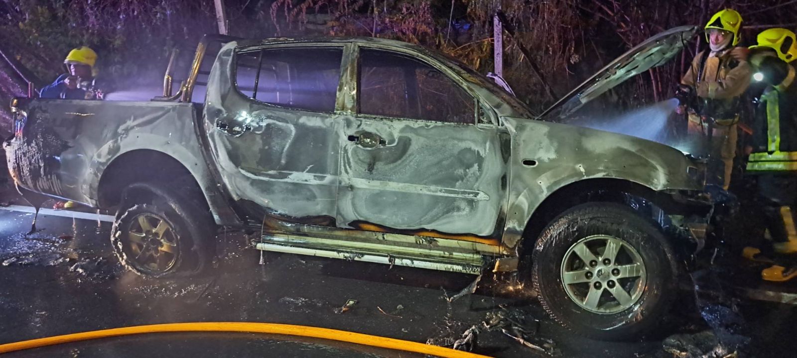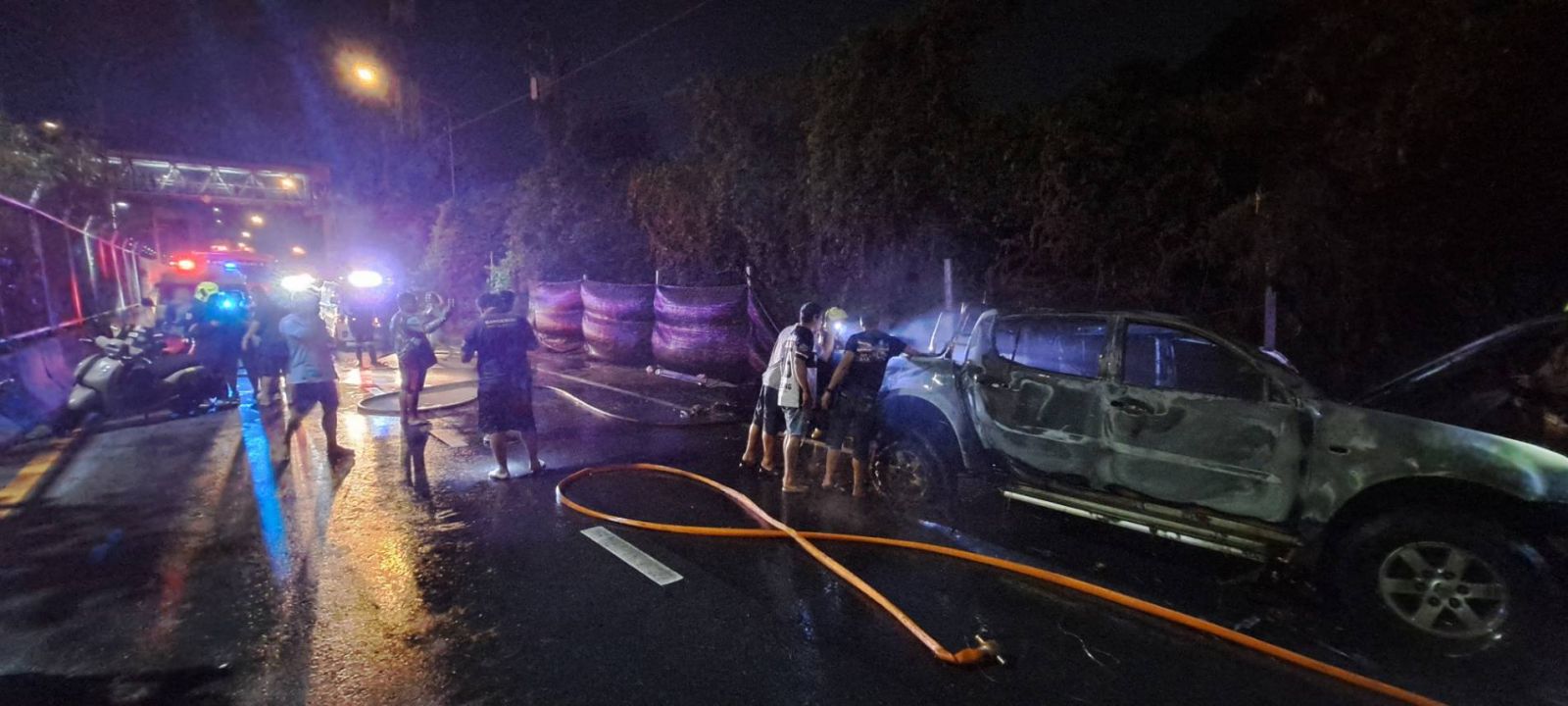 ที่เกิดเหตุ พบรถกระบะ สีขาว ป้ายทะเบียน สุราษฎร์ธานี จอดอยู่ริมถนนข้างทาง และพบว่าเพลิงกำลังลุกไหม้รุนแรง เจ้าหน้าที่ดับเพลิงเทศบาลเมืองบางกรวย สนับสนุนที่เกิดเหตุ ใช้น้ำฉีดดับเพลิงสงบ เพลิงลุกไหม้เสียหายหมดทั้งคัน รถใช้เชื้อเพลิงแก๊ส CNG/NGV