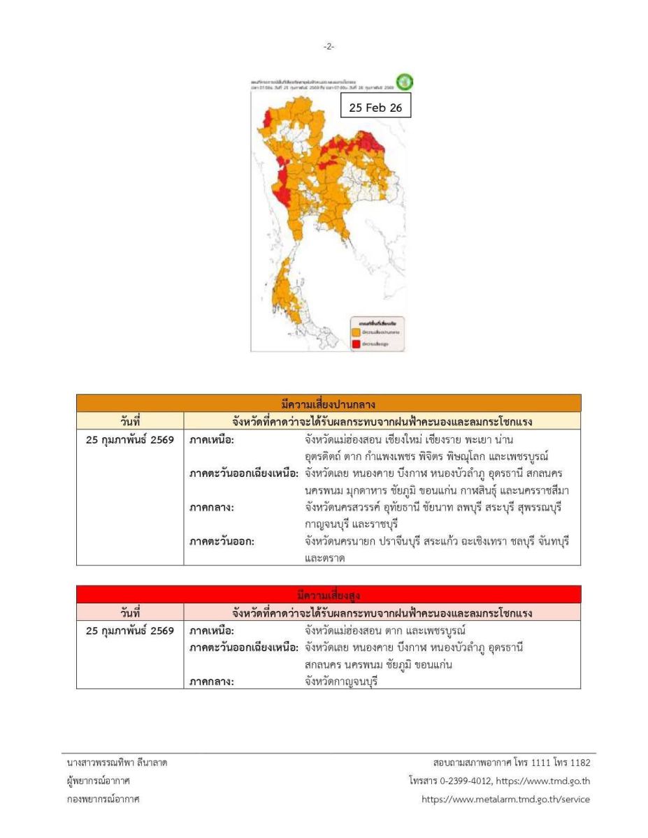 ประกาศกรมอุตุนิยมวิทยา เรื่อง พายุฤดูร้อนบริเวณประเทศไทยตอนบน (มีผลกระทบจนถึงวันที่ 25 กุมภาพันธ์ 2569) ฉบับที่ 6 (6/2569)