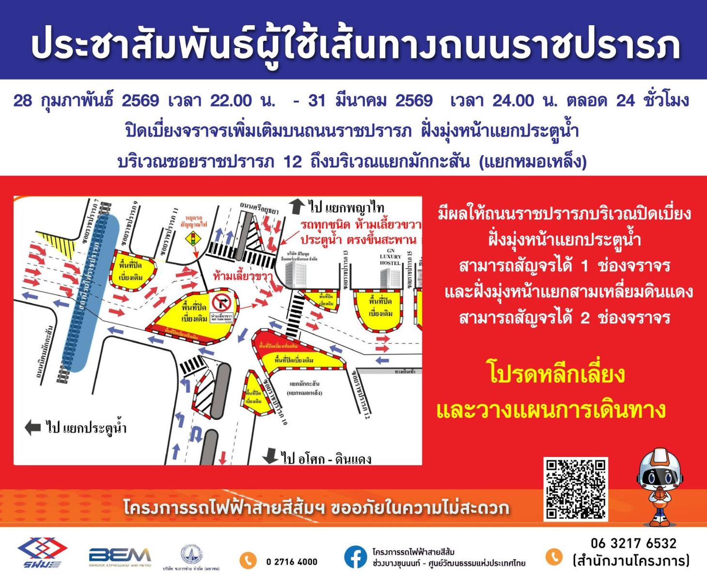 การรถไฟฟ้าขนส่งมวลชนแห่งประเทศไทย (รฟม.) แจ้งว่า บริษัท ช.การช่าง จำกัด (มหาชน) ผู้รับจ้างของ บริษัท ทางด่วนและรถไฟฟ้ากรุงเทพ จำกัด (มหาชน) ซึ่งเป็นผู้ร่วมลงทุนโครงการรถไฟฟ้าสายสีส้ม ช่วงบางขุนนนท์ - ศูนย์วัฒนธรรมแห่งประเทศไทย ปัจจุบันอยู่ระหว่างดำเนินการก่อสร้างสถานีรถไฟฟ้าใต้ดินราชปรารภ (OR10) ซึ่งตั้งอยู่บริเวณถนนราชปรารภ โดยมีแผนจะดำเนินการปิดเบี่ยงจราจรเพิ่มเติม บนถนนราชปรารภ ฝั่งมุ่งหน้าประตูน้ำบริเวณซอยราชปรารภ 12 ถึงบริเวณแยกมักกะสัน (แยกหมอเหล็ง) เพื่อดำเนินงานก่อสร้างกำแพงกันดิน (Diaphragm Wall) ตั้งแต่วันที่ 28 กุมภาพันธ์ 2569 เวลา 22.00 น. – 31 มีนาคม 2569 เวลา 24.00 น. ตลอด 24 ชั่วโมง ผลให้ถนนราชปรารภบริเวณปิดเบี่ยง ฝั่งมุ่งหน้าแยกประตูน้ำ สามารถสัญจรได้ 1 ช่องจราจร และฝั่งมุ่งหน้าแยกสามเหลี่ยมดินแดงสามารถสัญจรได้ 2 ช่องจราจร และห้ามรถทุกชนิดที่มาจากถนนศรีอยุธยาเลี้ยวขวาไปประตูน้ำ โดยให้ตรงไปขึ้นสะพานแล้วกลับรถที่บึงมักกะสันเท่านั้น