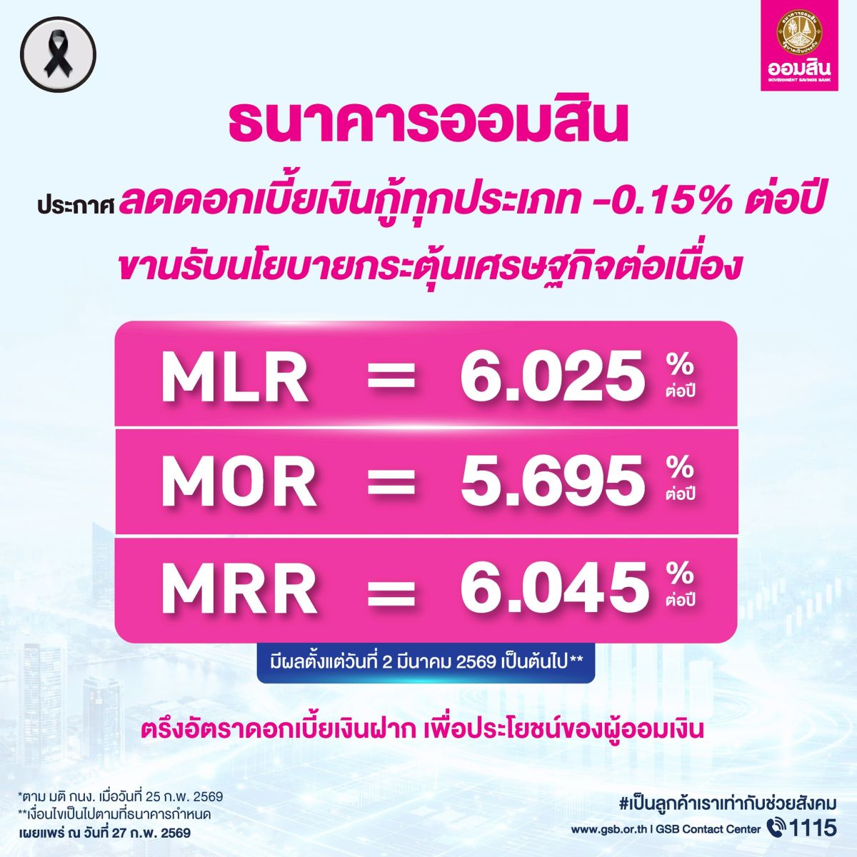 นางลภาวรรณ จันทร์กระจ่าง รองผู้อำนวยการธนาคารออมสิน รักษาการแทนผู้อำนวยการธนาคารออมสิน เปิดเผยว่า ธนาคารประกาศลดอัตราดอกเบี้ยเงินกู้อีกครั้งในรอบ 2 เดือน เพื่อสนับสนุนนโยบายกระตุ้นการฟื้นตัวของเศรษฐกิจอย่างต่อเนื่อง และช่วยบรรเทาภาระหนี้ ตามมติคณะกรรมการนโยบายการเงิน (กนง.) และสอดคล้องตามนโยบายกระทรวงการคลัง โดยครั้งนี้ธนาคารปรับลดดอกเบี้ยเงินกู้ทุกประเภทสินเชื่อลง 0.15% ต่อปี ส่งผลให้อัตราดอกเบี้ยเงินกู้ขั้นต่ำประเภทเงินกู้ที่มีระยะเวลา (MLR) ลดเหลือ 6.025% ต่อปี อัตราดอกเบี้ยเงินกู้ขั้นต่ำประเภทเงินเบิกเกินบัญชี (MOR) ลดเหลือ 5.695% ต่อปี และอัตราดอกเบี้ยเงินกู้ลูกค้ารายย่อยชั้นดี (MRR) ลดเหลือ 6.045% ต่อปี ซึ่งนับเป็นอัตราดอกเบี้ยเงินกู้ทุกประเภทแตะระดับต่ำสุดในระบบสถาบันการเงิน ทั้งธนาคารพาณิชย์และสถาบันการเงินของรัฐ มีผลตั้งแต่วันที่ 2 มีนาคม 2569 เป็นต้นไป โดยธนาคารออมสินพร้อมสนับสนุนการปล่อยสินเชื่อเติมสภาพคล่องเข้าสู่ระบบเศรษฐกิจที่กำลังมีแนวโน้มเติบโตดีขึ้นอย่างต่อเนื่อง สำหรับการลดดอกเบี้ยเงินกู้ในครั้งนี้ ตั้งเป้าช่วยลดต้นทุนทางการเงินของผู้ประกอบการ SMEs และผู้ประกอบการรายย่อย ให้สามารถดำเนินธุรกิจคล่องตัวและเพิ่มขีดความสามารถในการแข่งขัน ทั้งยังเป็นการบรรเทาภาระหนี้แก่ลูกหนี้รายย่อย