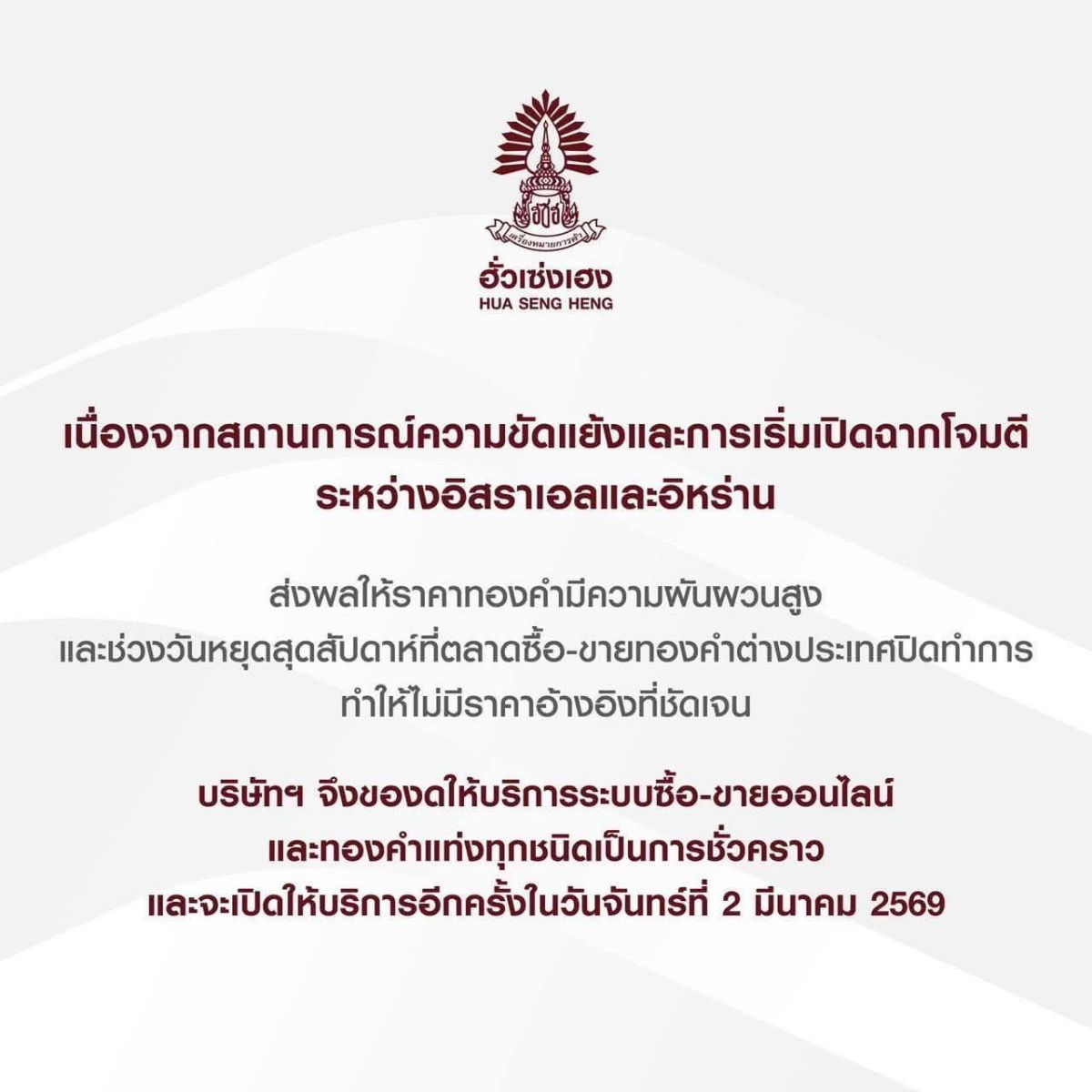 ล่าสุด เพจ HSHsocial ฮั่วเซ่งเฮง ได้ออกมาประกาศ "งดให้บริการระบบซื้อ-ขายออนไลน์ และทองคำแท่งทุกชนิดเป็นการชั่วคราว" แล้ว เบื้องต้นได้แก่ “เนื่องจากสถานการณ์ความขัดแย้งและการเริ่มเปิดฉากโจมตีระหว่าง อิสราเอล และ อิหร่าน ส่งผลให้ ราคาทองคำ มีความผันผวนสูง และช่วงวันหยุดสุดสัปดาห์ที่ตลาดซื้อ-ขายทองคำต่างประเทศปิดทำการ ทำให้ไม่มีราคาอ้างอิงที่ชัดเจน บริษัทฯ จึงของดให้บริการระบบซื้อ-ขายออนไลน์ และทองคำแท่งทุกชนิดเป็นการชั่วคราว บริษัทฯ จะเปิดให้บริการอีกครั้งในวันจันทร์ที่ 2 มีนาคม 2569“
