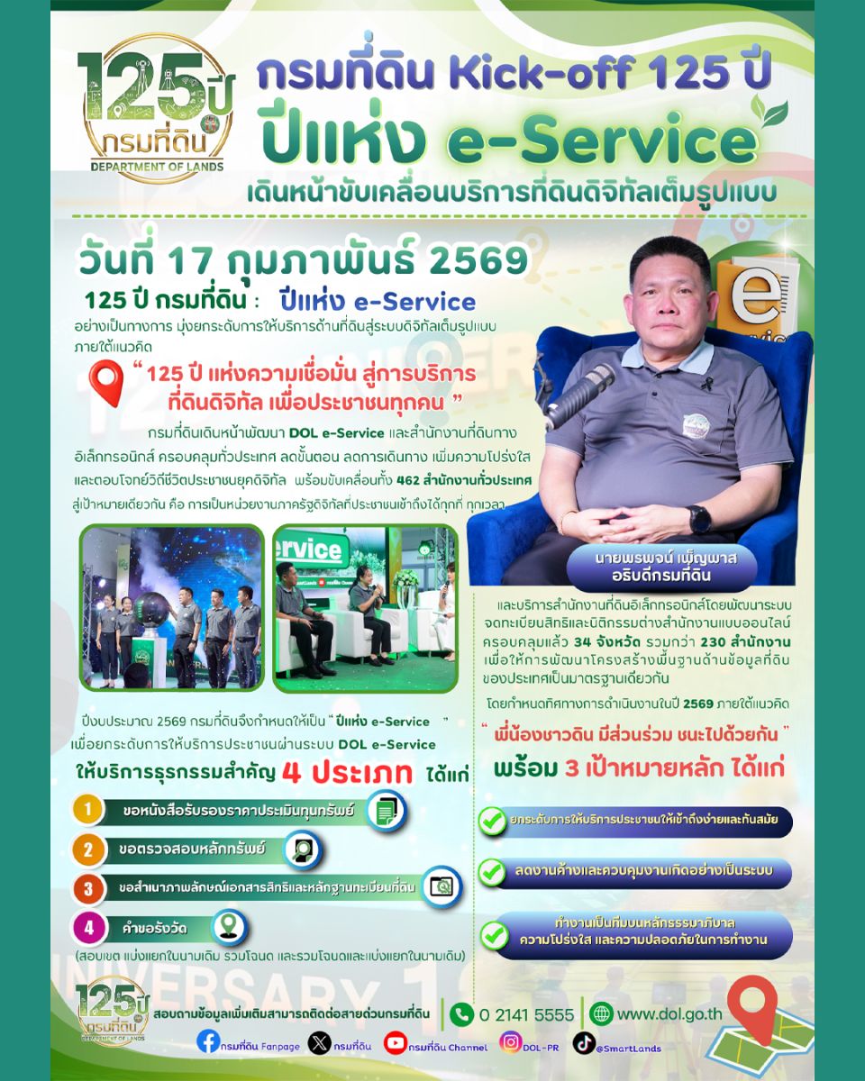 กรมที่ดินเปิดตัว (Kick-off) โครงการ “125 ปี กรมที่ดิน : ปีแห่ง e-Service” มุ่งยกระดับการให้บริการด้านที่ดินสู่ระบบดิจิทัลเต็มรูปแบบ ภายใต้แนวคิด “125 ปี แห่งความเชื่อมั่น สู่การบริการที่ดินดิจิทัล เพื่อประชาชนทุกคน” เดินหน้าพัฒนา DOL e-Service และสำนักงานที่ดินอิเล็กทรอนิกส์ ครอบคลุมทั่วประเทศ ลดขั้นตอน ลดการเดินทาง เพิ่มความโปร่งใส และตอบโจทย์วิถีชีวิตประชาชนยุคดิจิทัล พร้อมขับเคลื่อนทั้ง 462 สำนักงานทั่วประเทศสู่เป้าหมายเดียวกัน คือ การเป็นหน่วยงานภาครัฐดิจิทัลที่ประชาชนเข้าถึงได้ทุกที่ ทุกเวลา